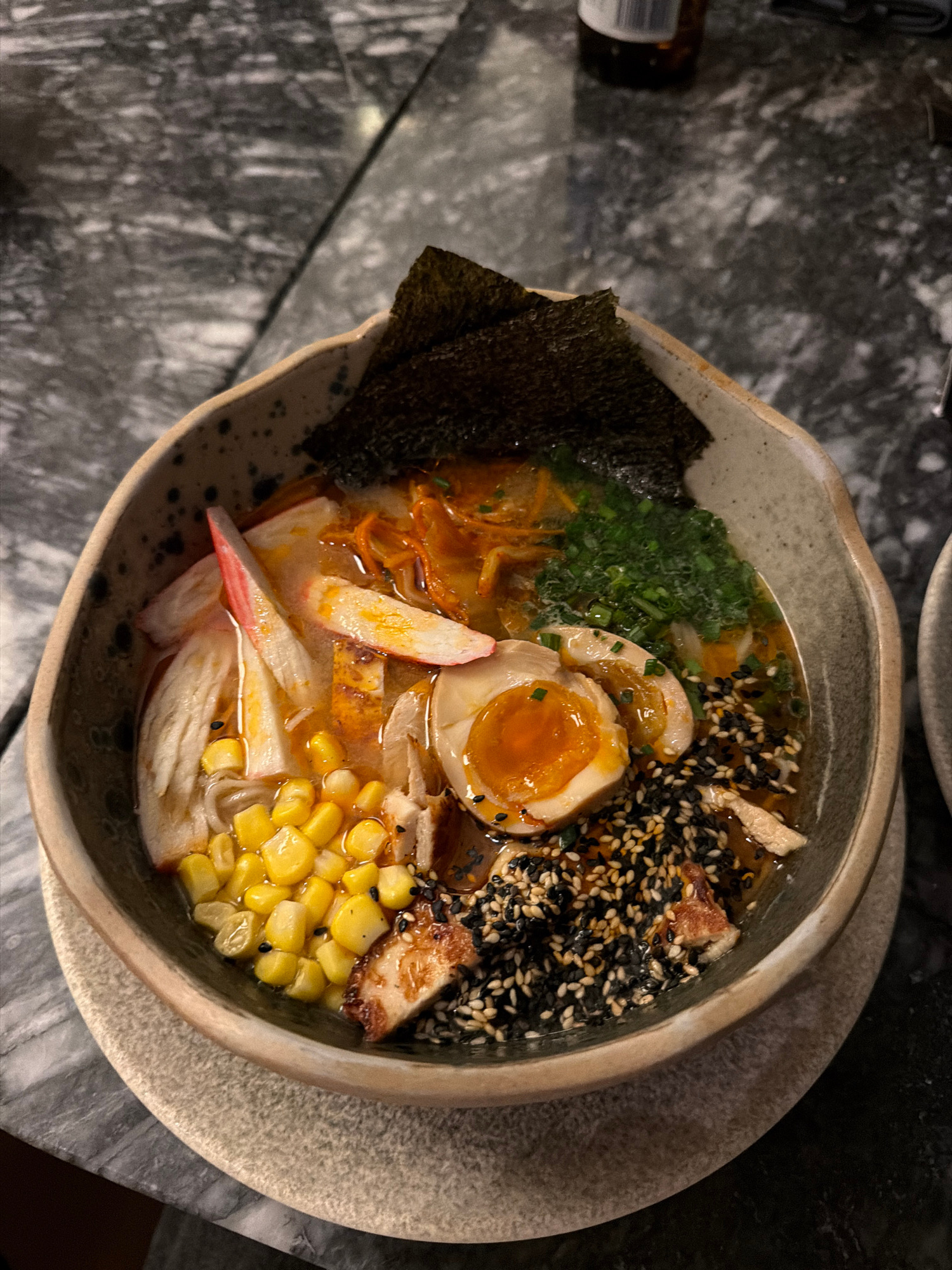 A close-up, high-angle shot shows a bowl of ramen, likely in a restaurant or dining establishment, possibly located in Batumi, Georgia, given the user's specification. The bowl sits on a neutral-tonedβ¦read more