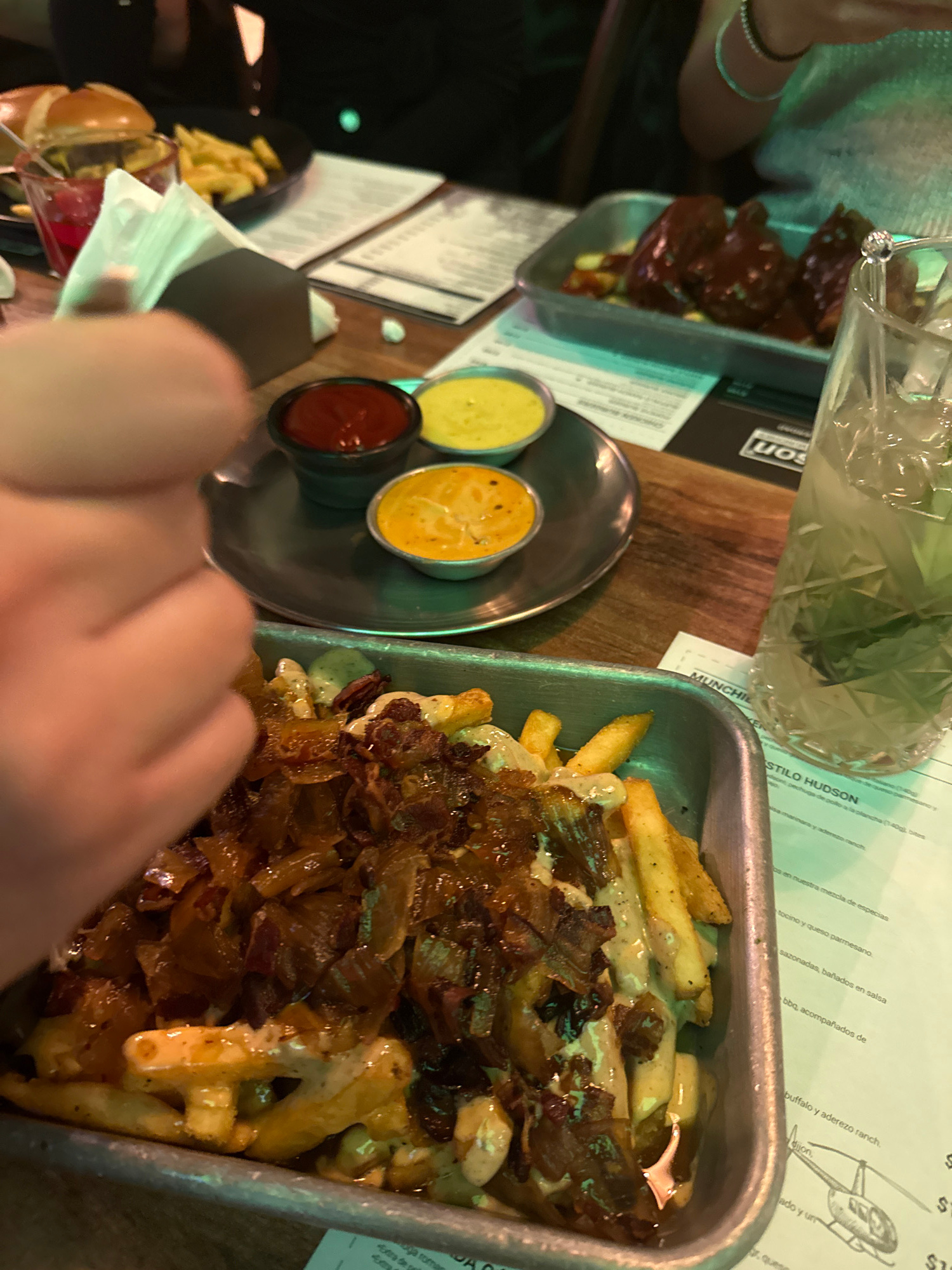 This image depicts a casual dining scene at a restaurant or bar in San Andrés Cholula, Mexico, likely in the evening given the dim, artificial lighting that casts a greenish tint. The primary subject…read more