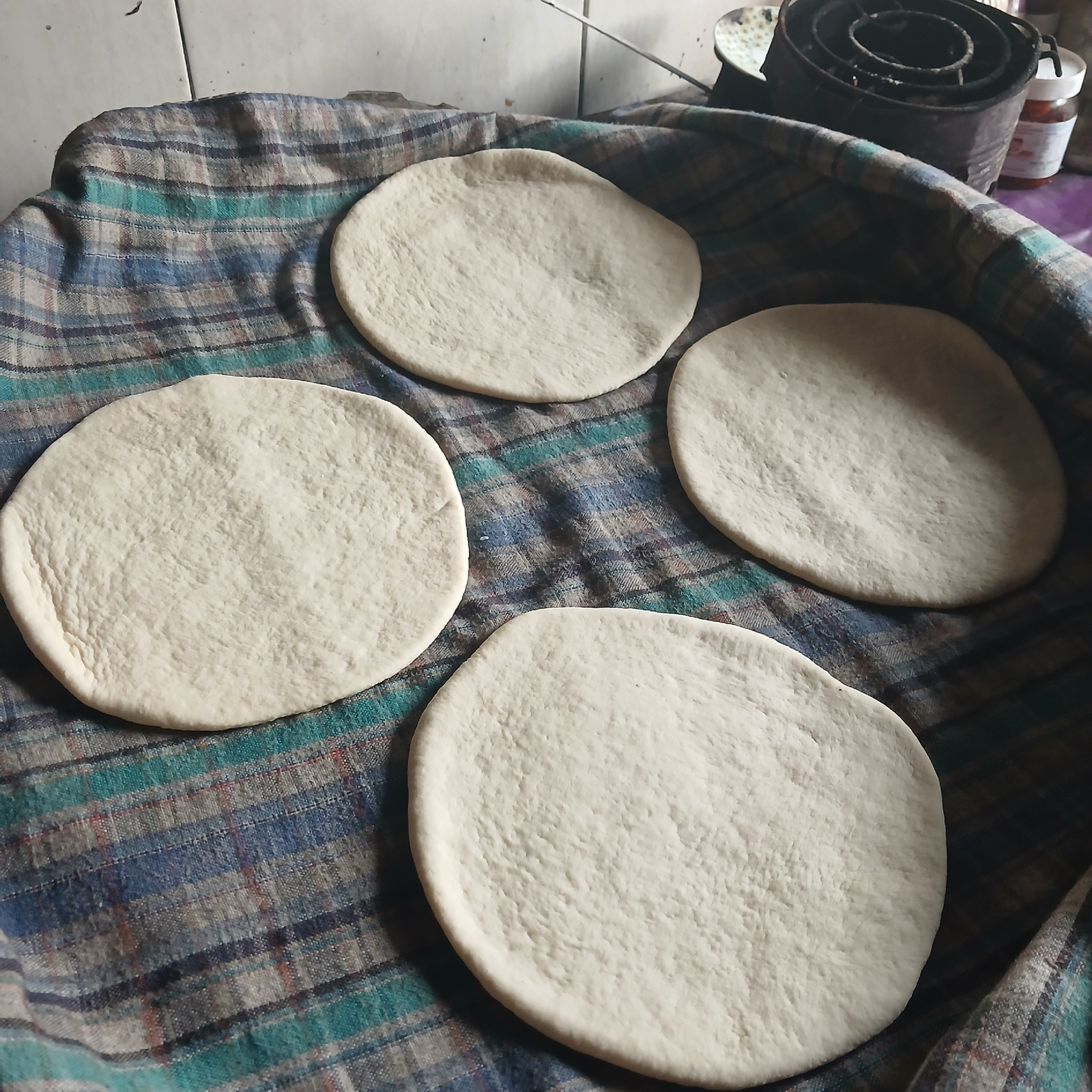 The image shows four unleavened dough rounds of varying sizes, resting on a blue, green, and grey plaid cloth. The cloth is draped over an unseen object. A metallic gas stove and food containers are p…read more
