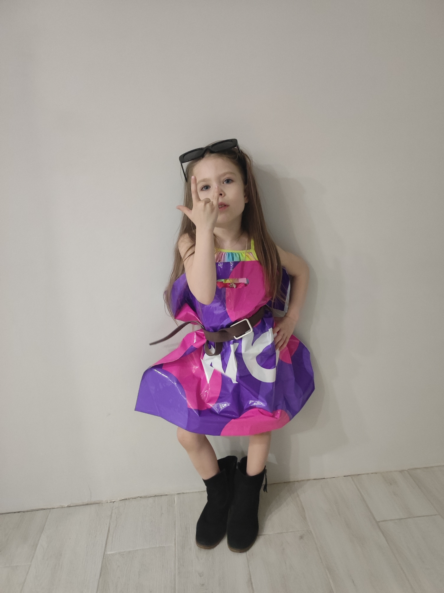 A full shot depicts a young girl standing against a light gray wall, striking a pose. She wears a dress constructed from a purple and pink plastic shopping bag, cinched at the waist with a brown belt.…read more