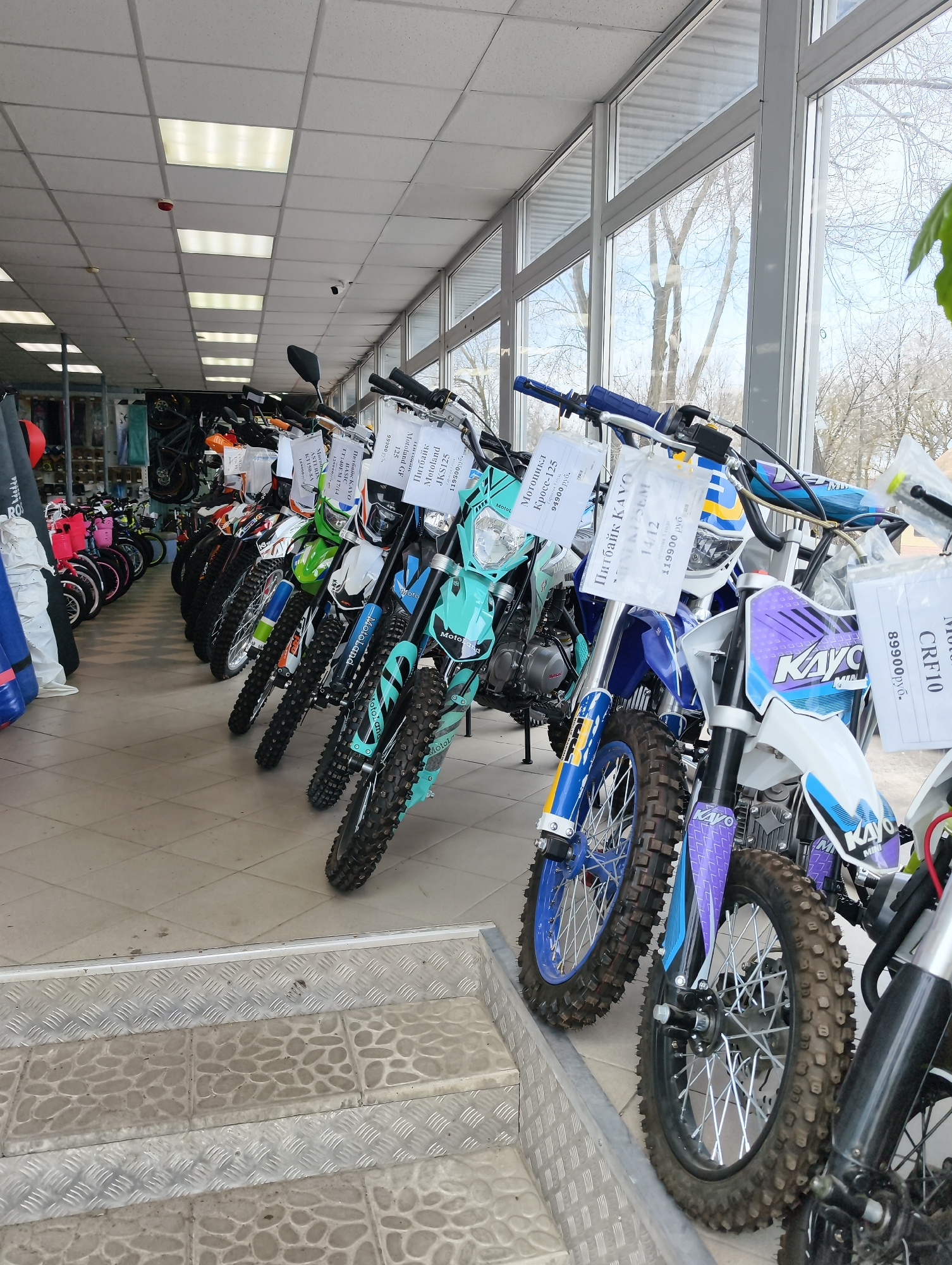The image shows a row of motorcycles displayed in a store, likely for sale, in Balashov, Russia. The motorcycles are various models and colors, with visible price tags attached. The store has a tiled…read more