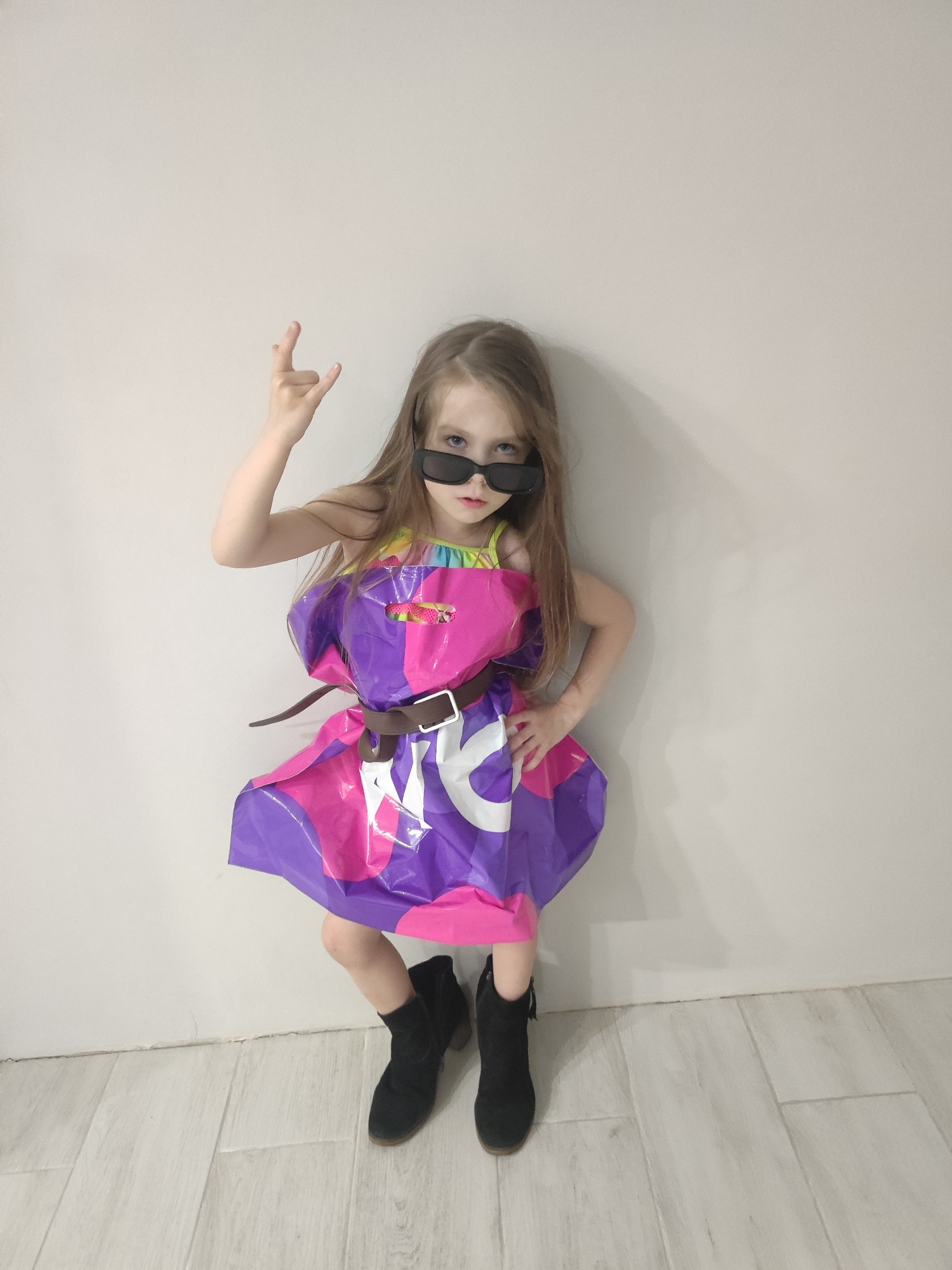 A young girl stands against a plain, light-colored wall. She is wearing black sunglasses and a dress made from a pink and purple plastic bag, cinched at the waist with a brown belt. She wears black an…read more