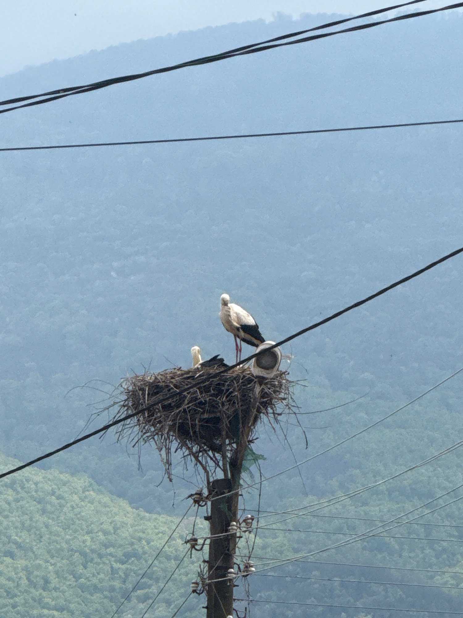 A white stork is standing in a large nest on top of a utility pole. Electrical wires run across the image. In the background is a green, mountainous landscape with a hazy sky. This is a photograph tak…read more