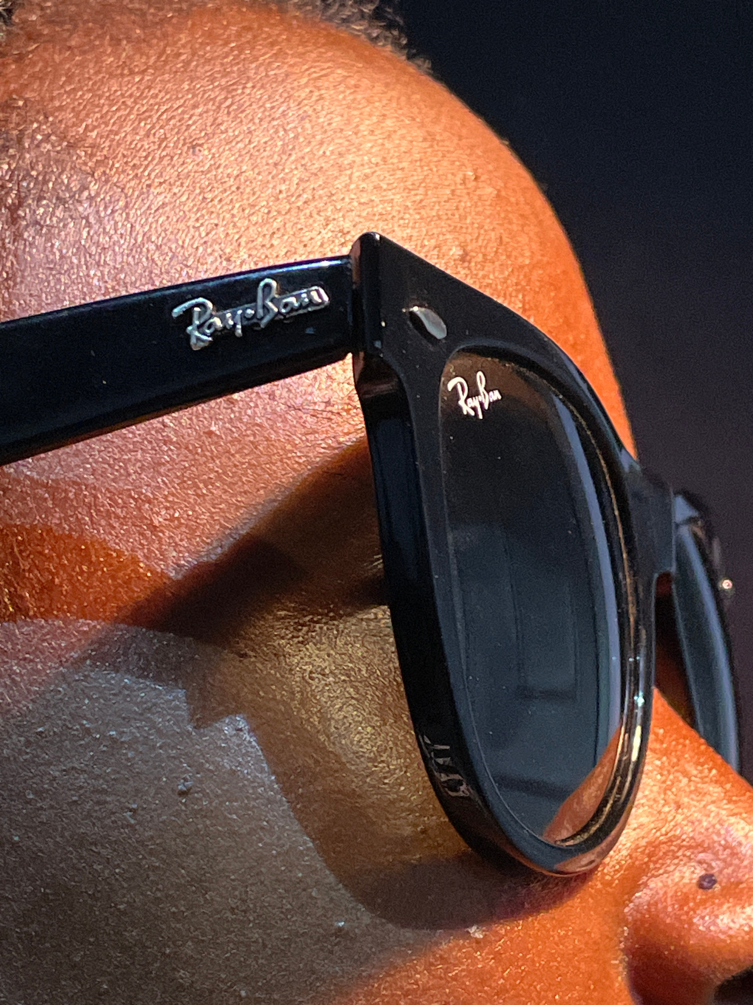 A close-up image focuses on a pair of black Ray-Ban sunglasses resting on a person's brown skin, likely the top of their head or shoulder. The "Ray-Ban" logo is prominently displayed on the side arm a…read more
