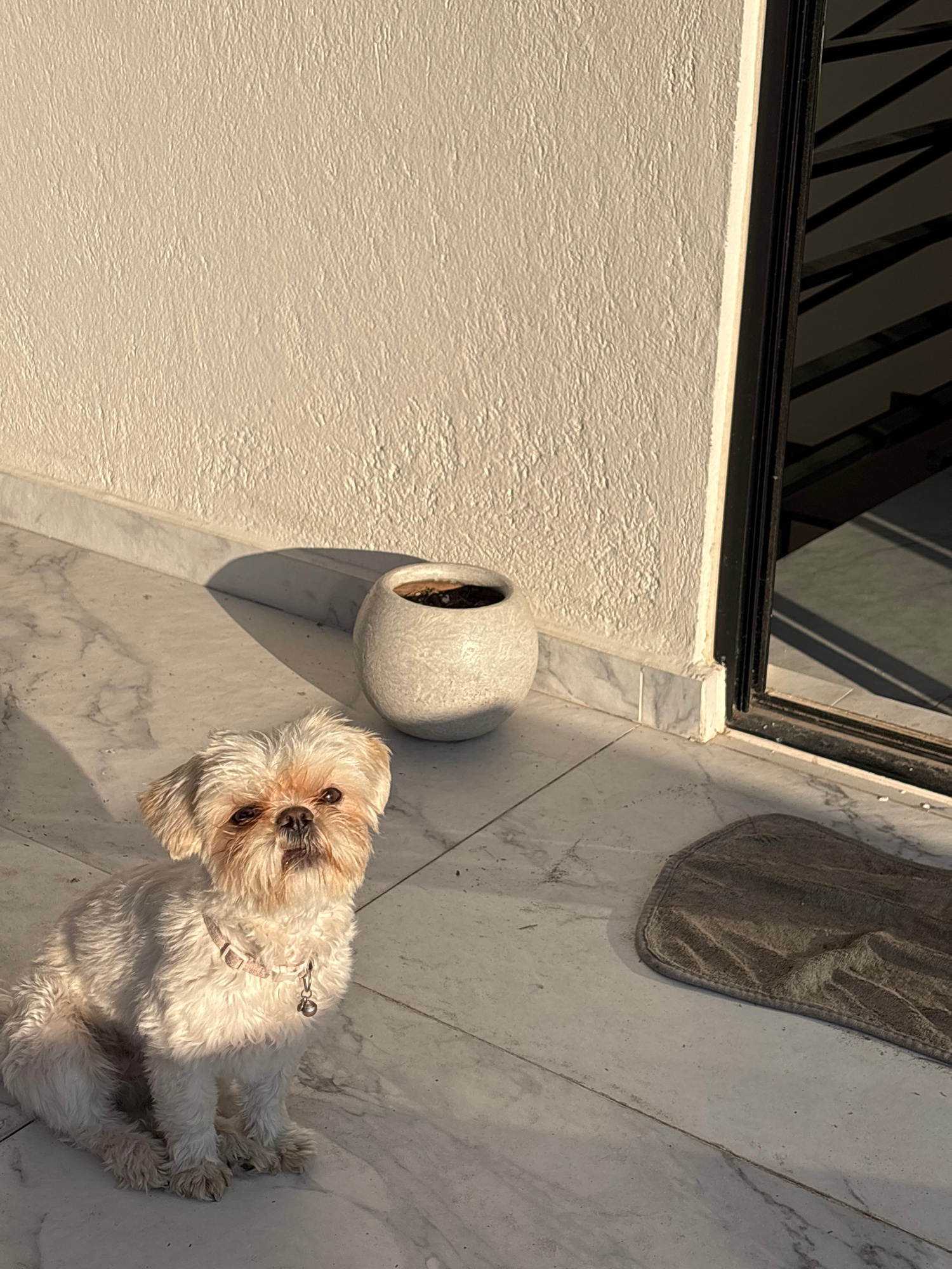 The image shows a small, white, furry dog sitting on a light-colored, marble-tiled floor next to a white wall. A white, round pot with dark contents sits between the dog and the wall. There's a gray m…read more