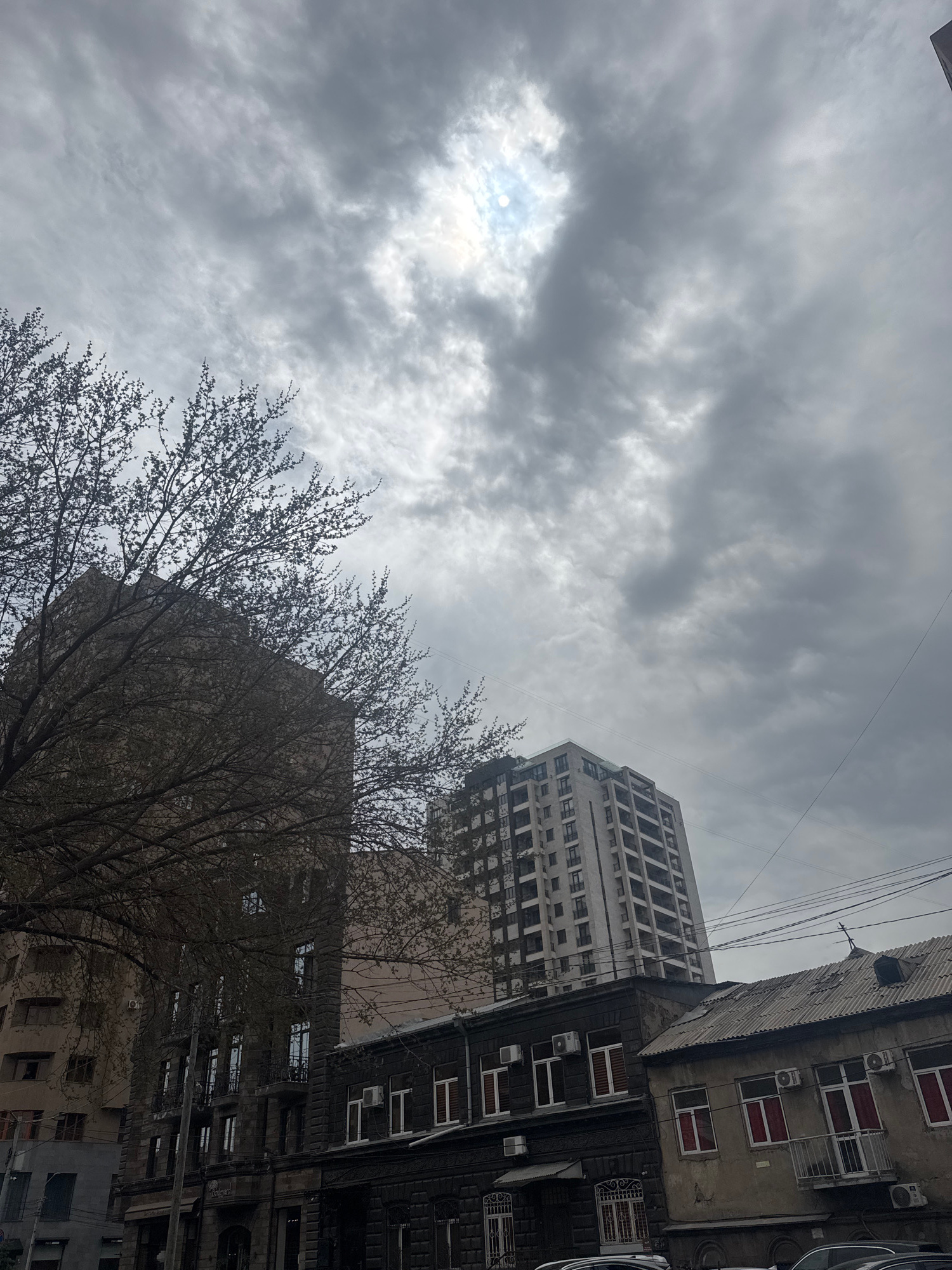 The image shows a low-angle view in Yerevan, Armenia. A cloudy sky obscures the sun. Buildings of various heights and architectural styles are visible. A tree with bare branches occupies the lower por…read more