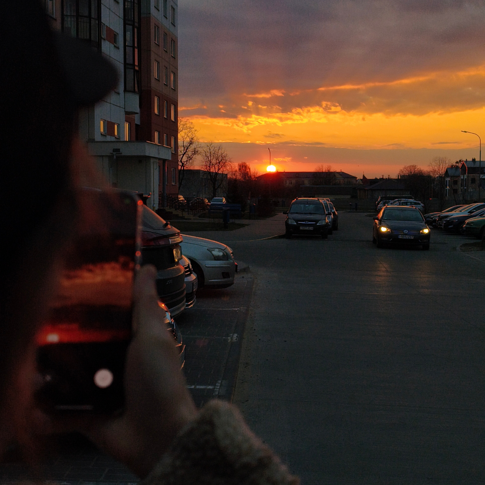 The image captures a street scene at dusk in Hrodna, Belarus. A person is taking a photograph with their smartphone of the sunset, which is vividly orange and red. The built environment includes a mul…read more
