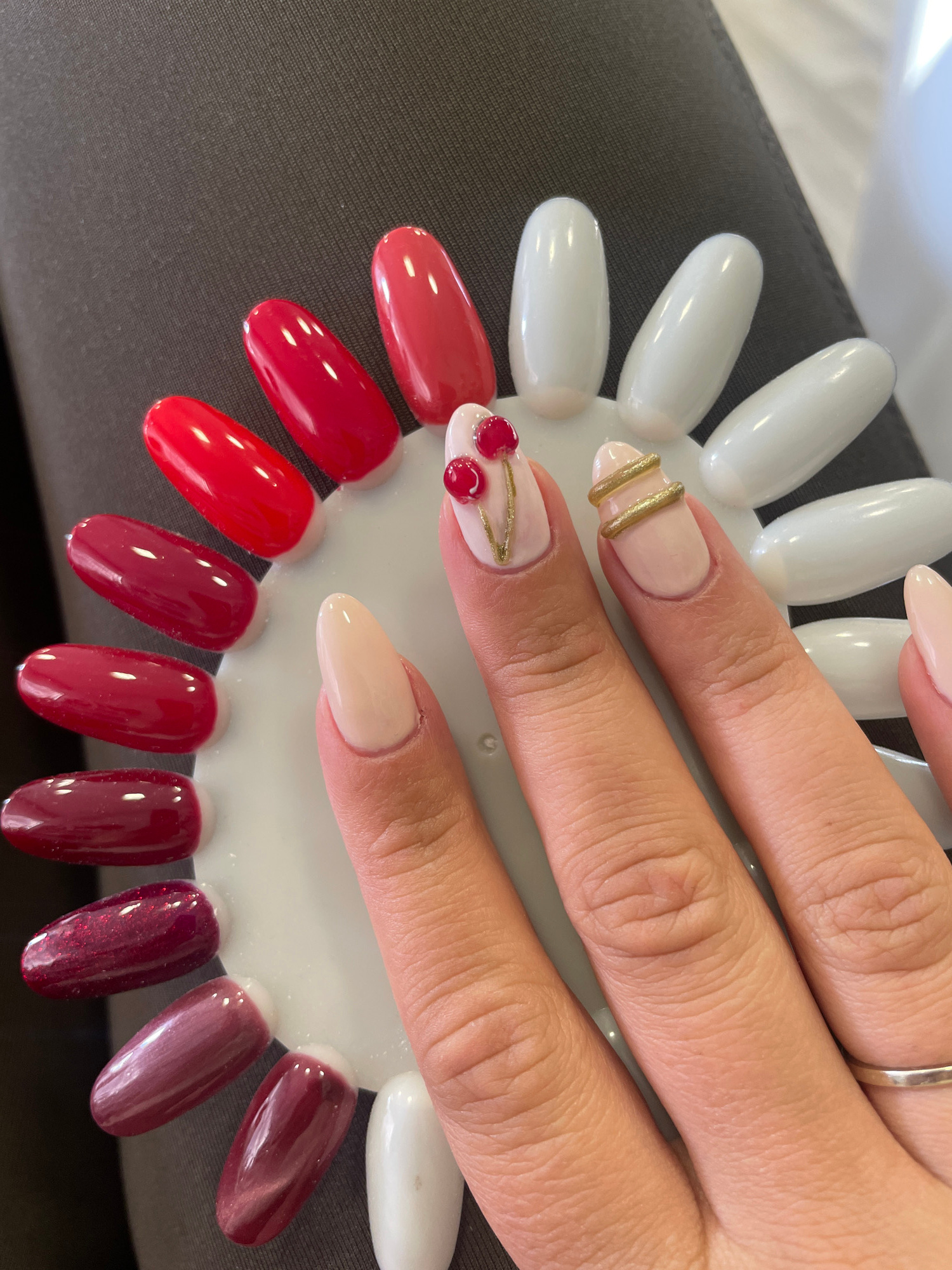 A close-up shot features a hand resting on a palette showcasing various nail polish colors, arranged in a semi-circle. The hand's fingernails are painted in a nude shade, except for the ring finger an…read more