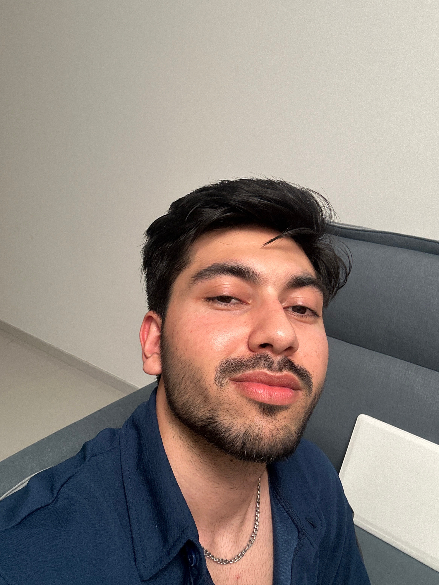 This portrait-style photo features a young man, presented as if his head is upright, though the original image is rotated. He is shown from the chest up, looking directly towards the viewer with a neu…read more