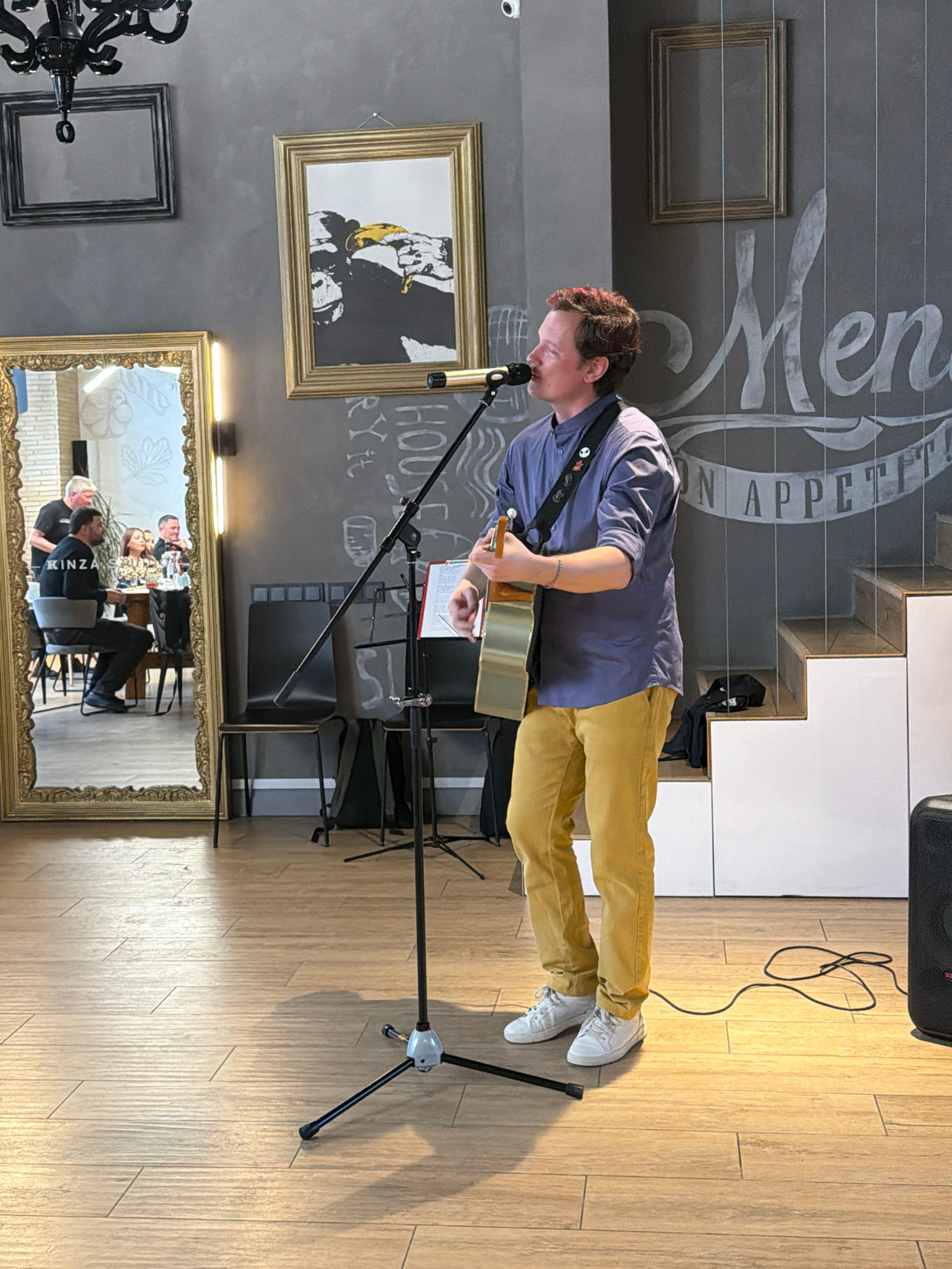 A man is standing and playing an acoustic guitar into a microphone in a room that appears to be a cafe or restaurant. The man is wearing a purple shirt, yellow pants, and white sneakers. Behind him is…read more