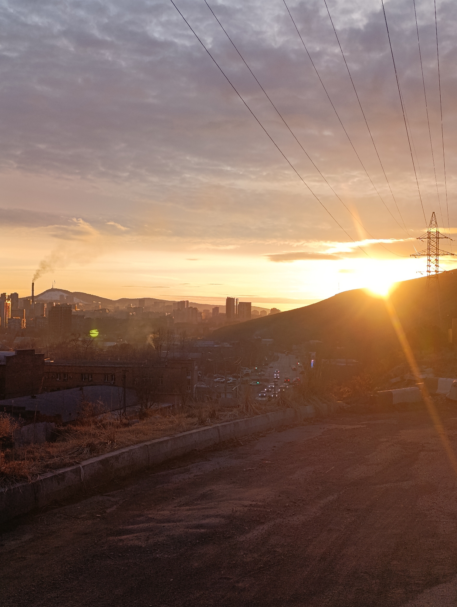 The image captures a sunset view overlooking Krasnoyarsk, Russia. The sky is filled with hues of orange and gray clouds. Power lines stretch across the upper right of the frame, connecting to a transm…read more