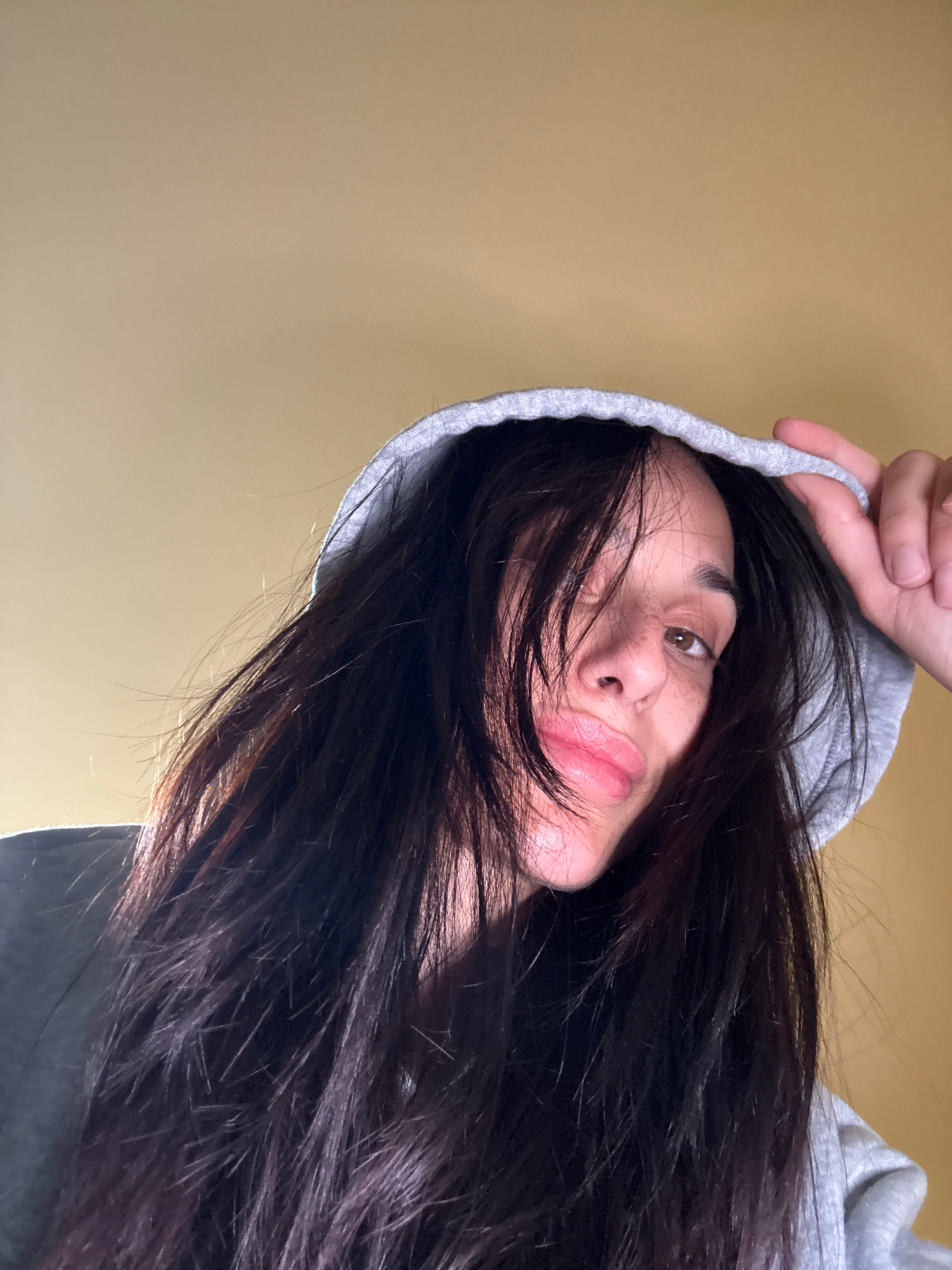 A woman with long, dark hair and a grey hoodie looks down at the camera with a slightly puckered expression. Her hood is up, partially obscuring her forehead. The background is a solid light brown or…read more