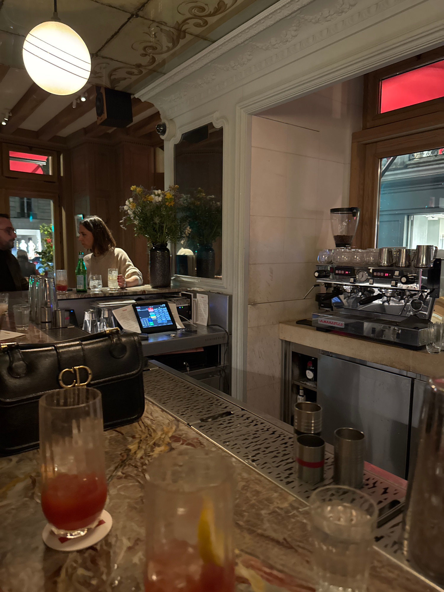 The image depicts the interior of a bar or café in Paris, France. A woman with brown hair is standing behind the bar, near a computer screen, seemingly taking orders or managing transactions. In the f…read more