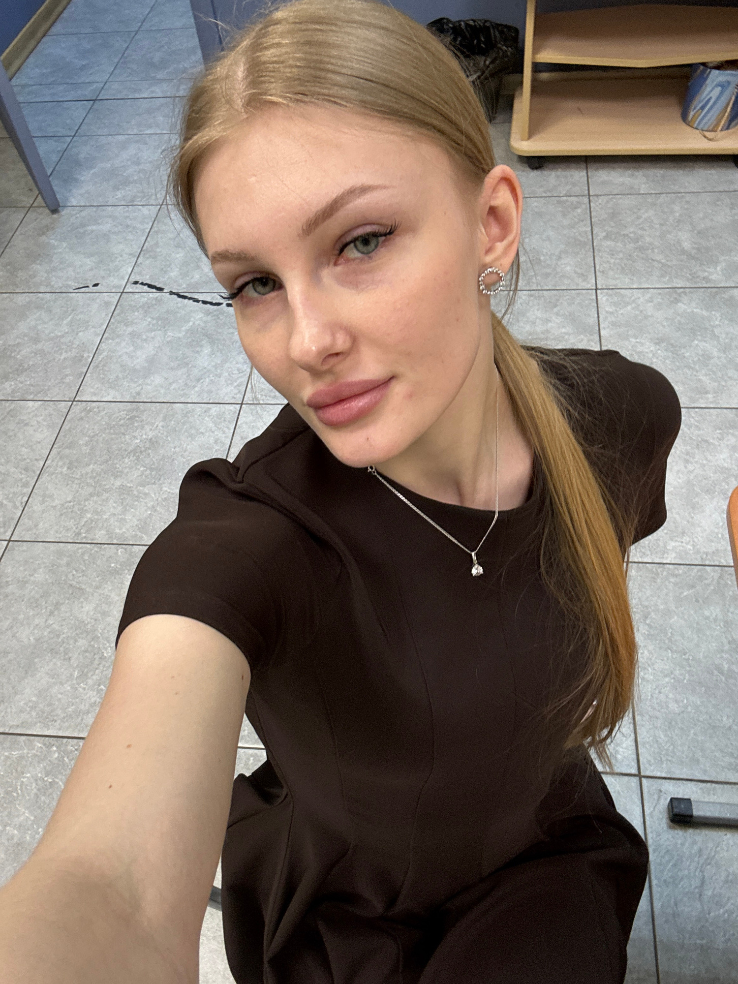 A woman with blonde hair and green eyes, wearing a brown dress and a necklace, is taking a selfie. She has an earring in her left ear. Black liquid is dripping from her left eye, down the tile wall. T…read more