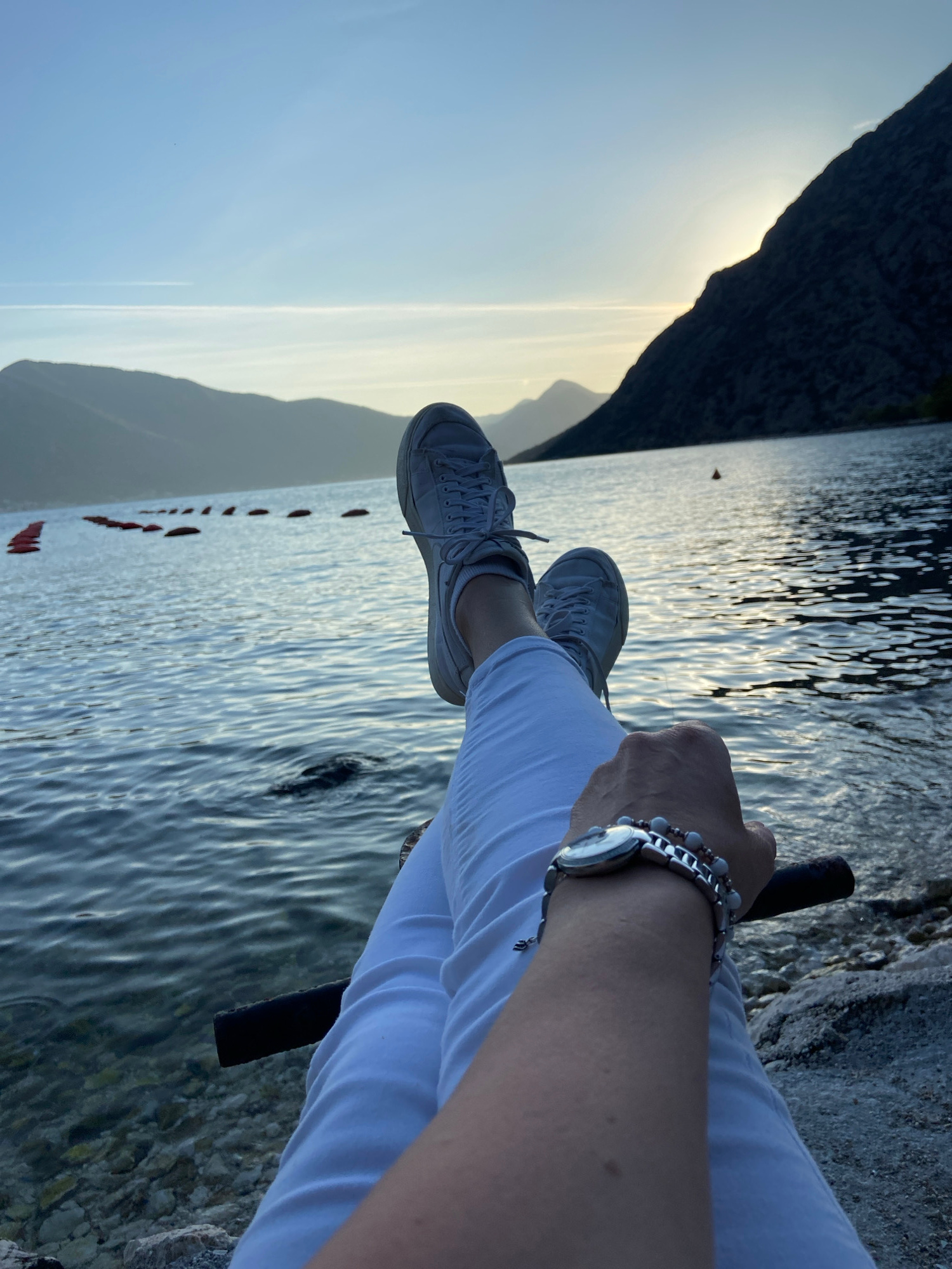 A person is sitting on what appears to be the edge of a structure or embankment, with their legs dangling over the water. They are wearing white pants and light gray sneakers. The person has a watch a…read more