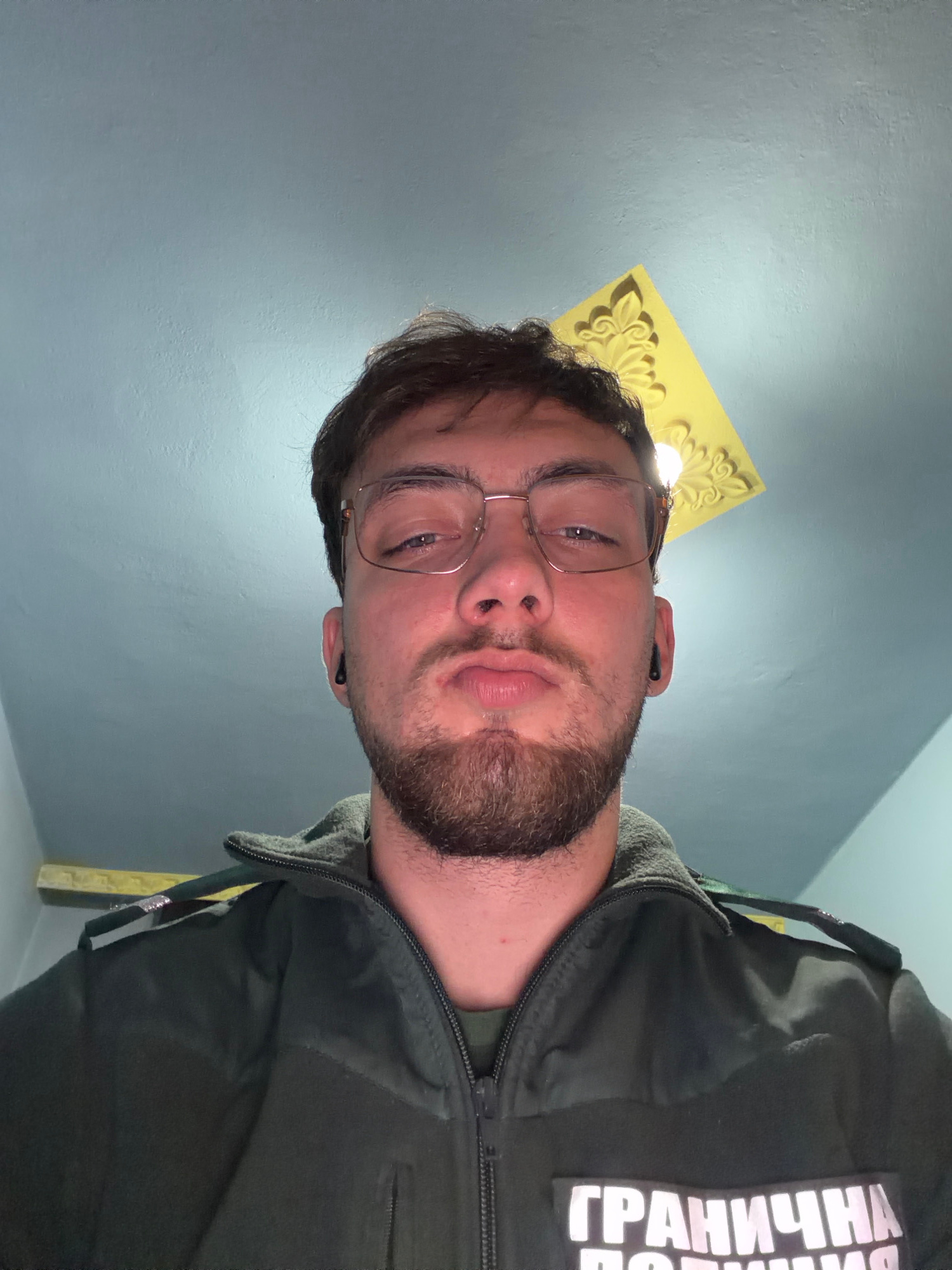A selfie of a man wearing glasses and a dark green jacket with a patch in Cyrillic reading "ГРАНИЧНА ПОЛІЦІЯ" (Border Police) is taken from a low angle indoors. The wall behind him is a light blue-gra…read more