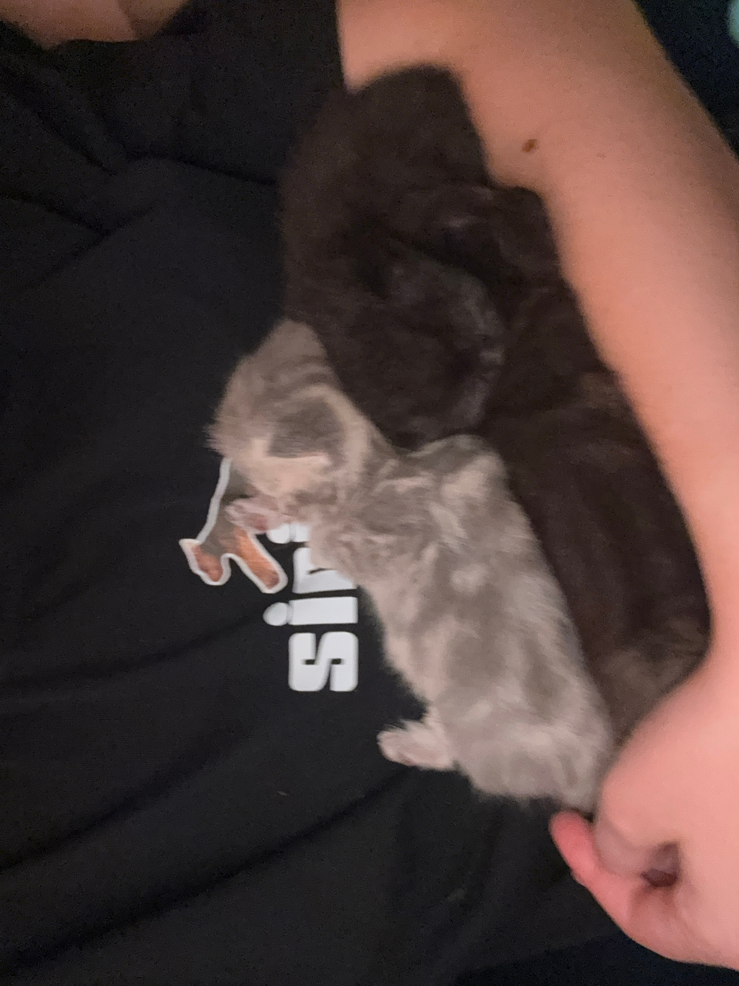 A person is holding two kittens on their chest. One kitten is dark brown, and the other is gray. The person is wearing a black t-shirt with white lettering. The location is not identifiable as being iā¦read more