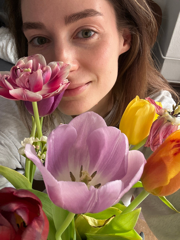 A close-up, eye-level indoor photograph depicts a female subject positioned behind a bouquet of assorted tulips. The subject, characterized by fair skin, green eyes, brown hair, and dark eyebrows, occ…read more