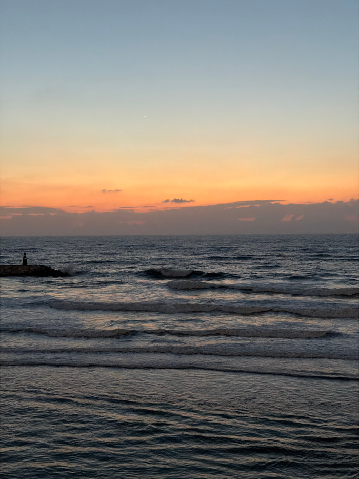 The image depicts a sunset over the Mediterranean Sea along the coastline of Tel-Aviv, Israel. The sky transitions from light blue at the top to a vibrant orange and yellow hue near the horizon, whereβ¦read more