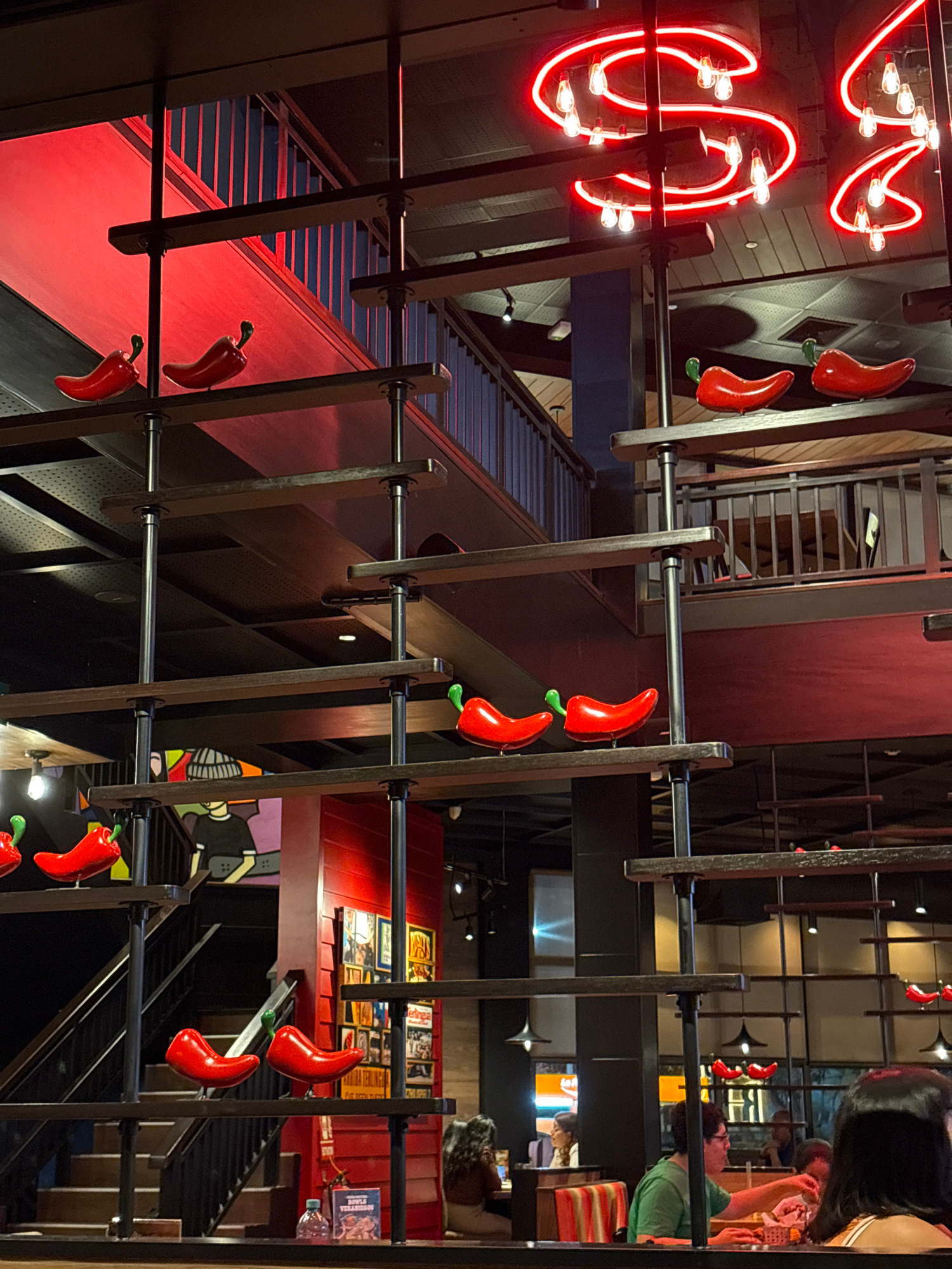 The image shows the interior of a Chili's restaurant, likely in Miraflores, Peru, given the distinctive decorative elements. A red neon sign in the shape of chili peppers hangs prominently. A decorati…read more
