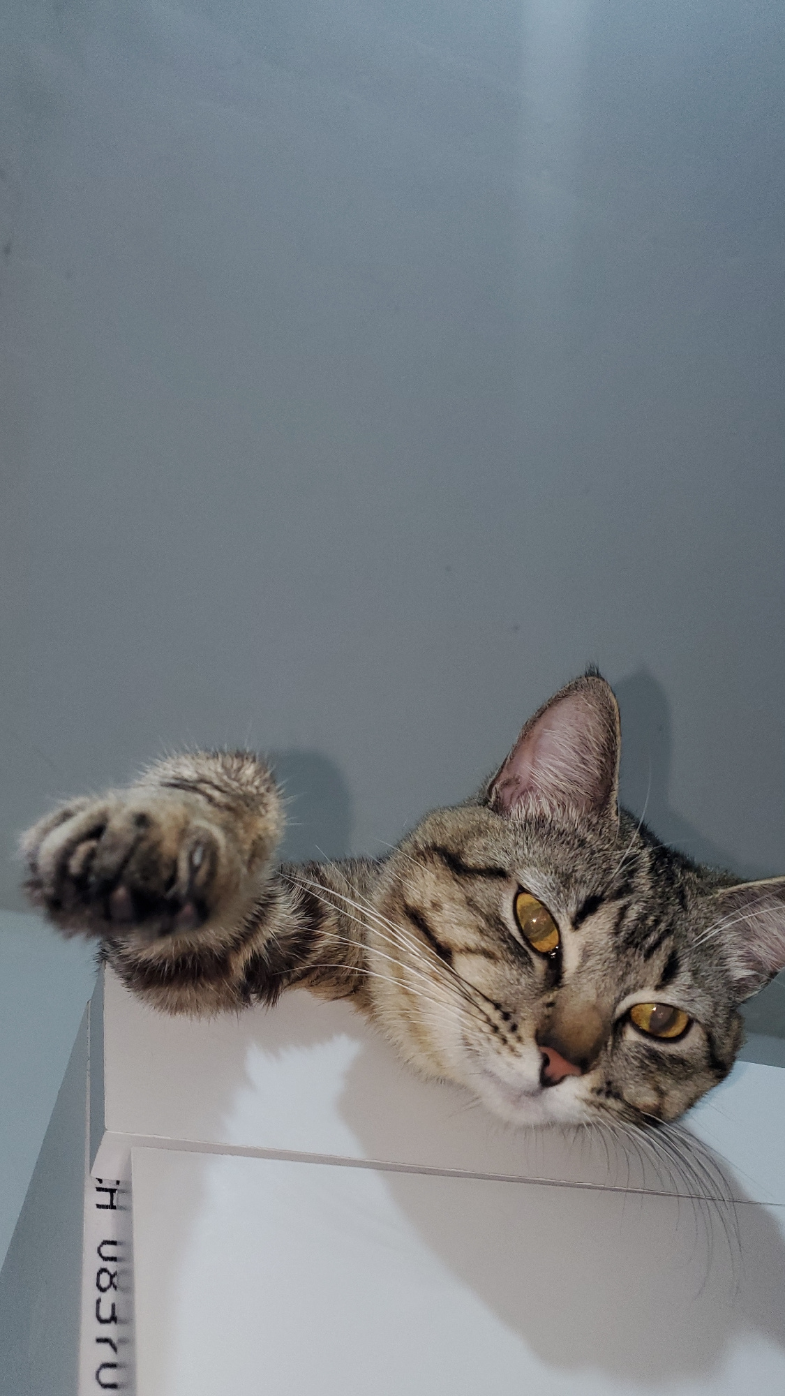 A cat's head, facing to the right of the frame, appears to be on top of a cabinet with its paw extended. The wall behind the cat is gray and plain. Part of the white cabinet is visible on the right si…read more