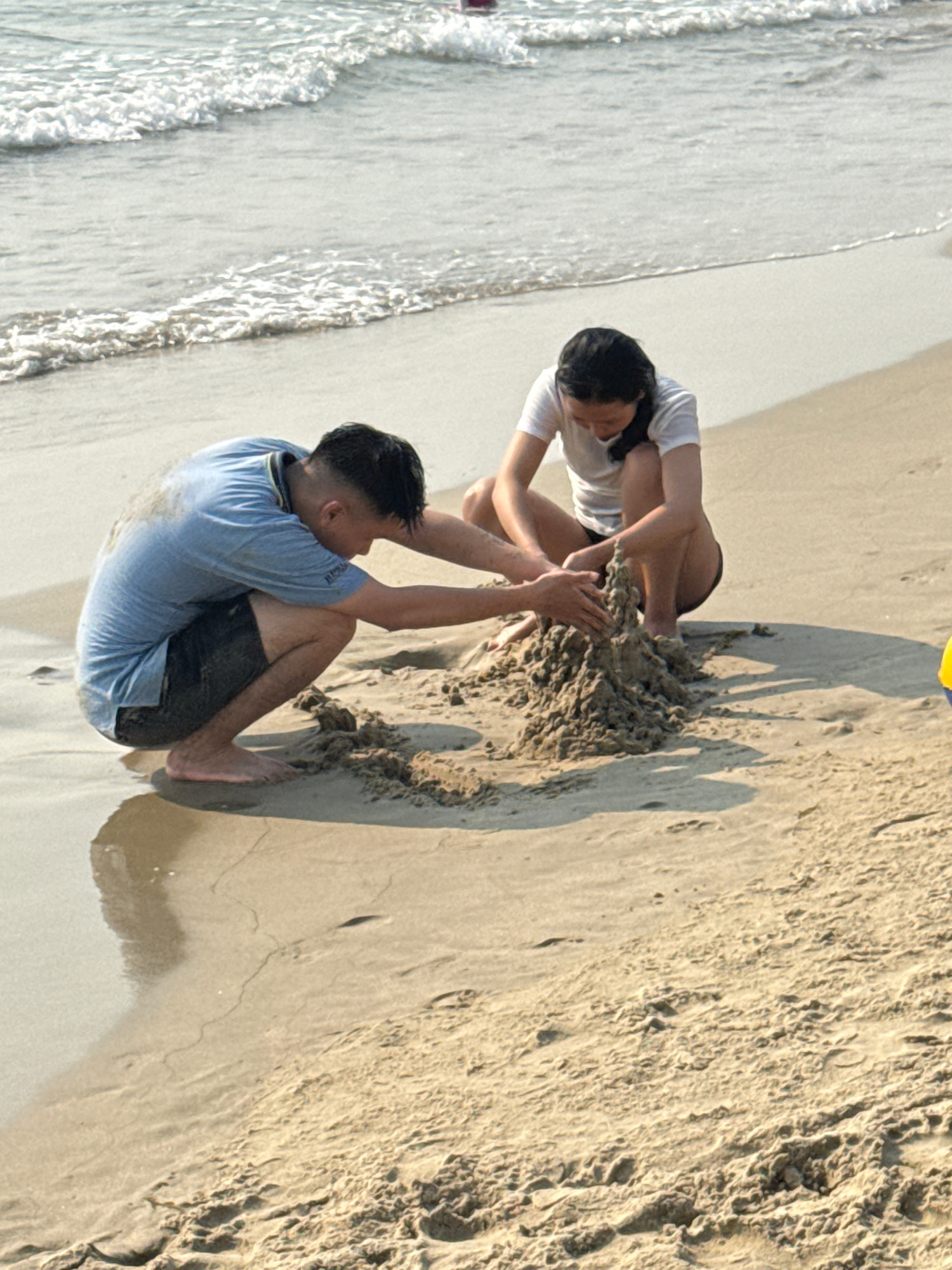 Two people are on a sandy beach constructing something with wet sand. The man is wearing a light blue t-shirt and black shorts. The woman is wearing a white t-shirt and black shorts. The scene is on a…read more