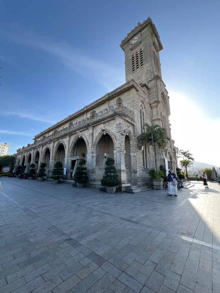 An exterior, low-angle, wide-shot photograph captures the stone facade of Nha Trang Cathedral (Christ the King Cathedral) in Nha Trang, Vietnam, under a clear blue sky. The Neo-Gothic style church, co…read more