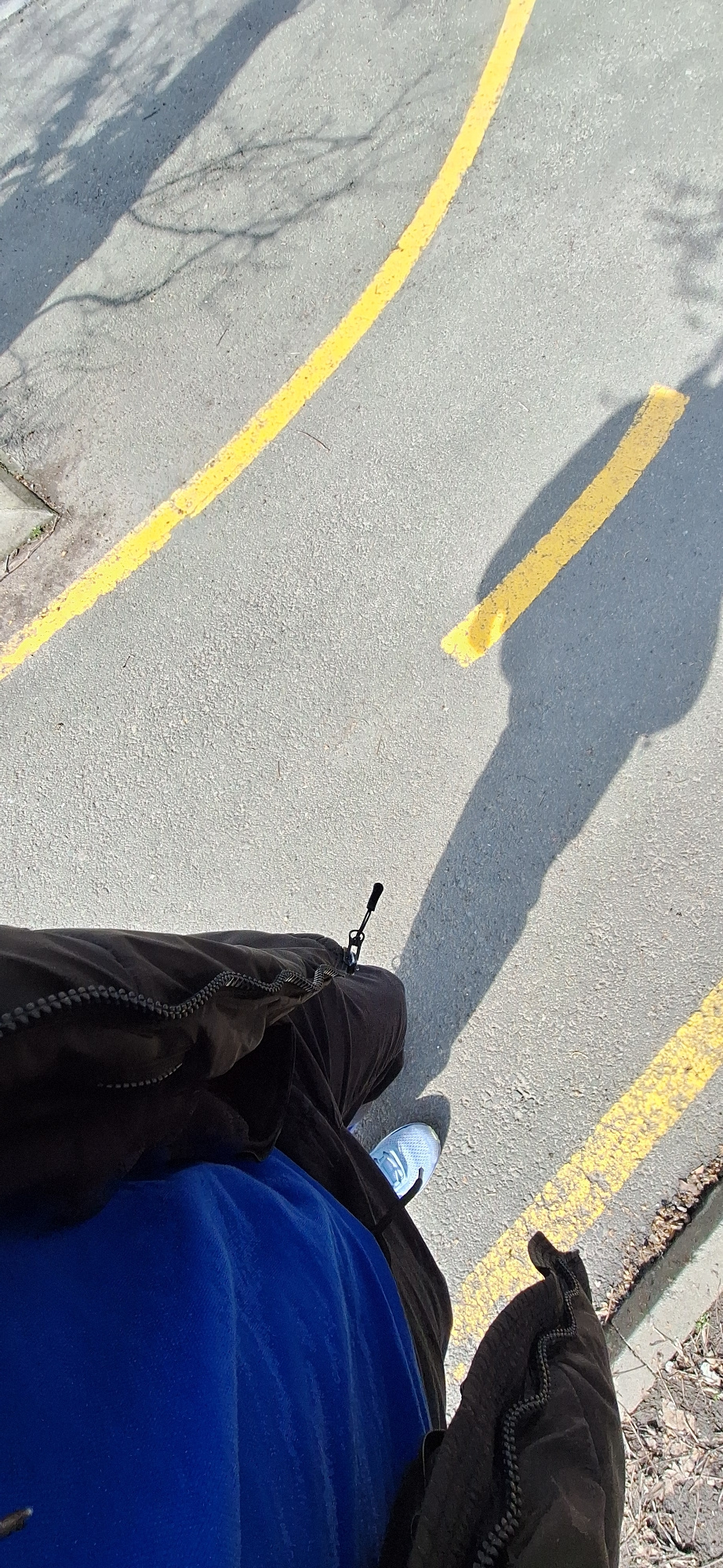 A top-down perspective image shows a person standing on a paved surface in Burgas, Bulgaria. The person is wearing a blue shirt, dark-colored jacket, and dark pants with light-colored shoes. Yellow li…read more