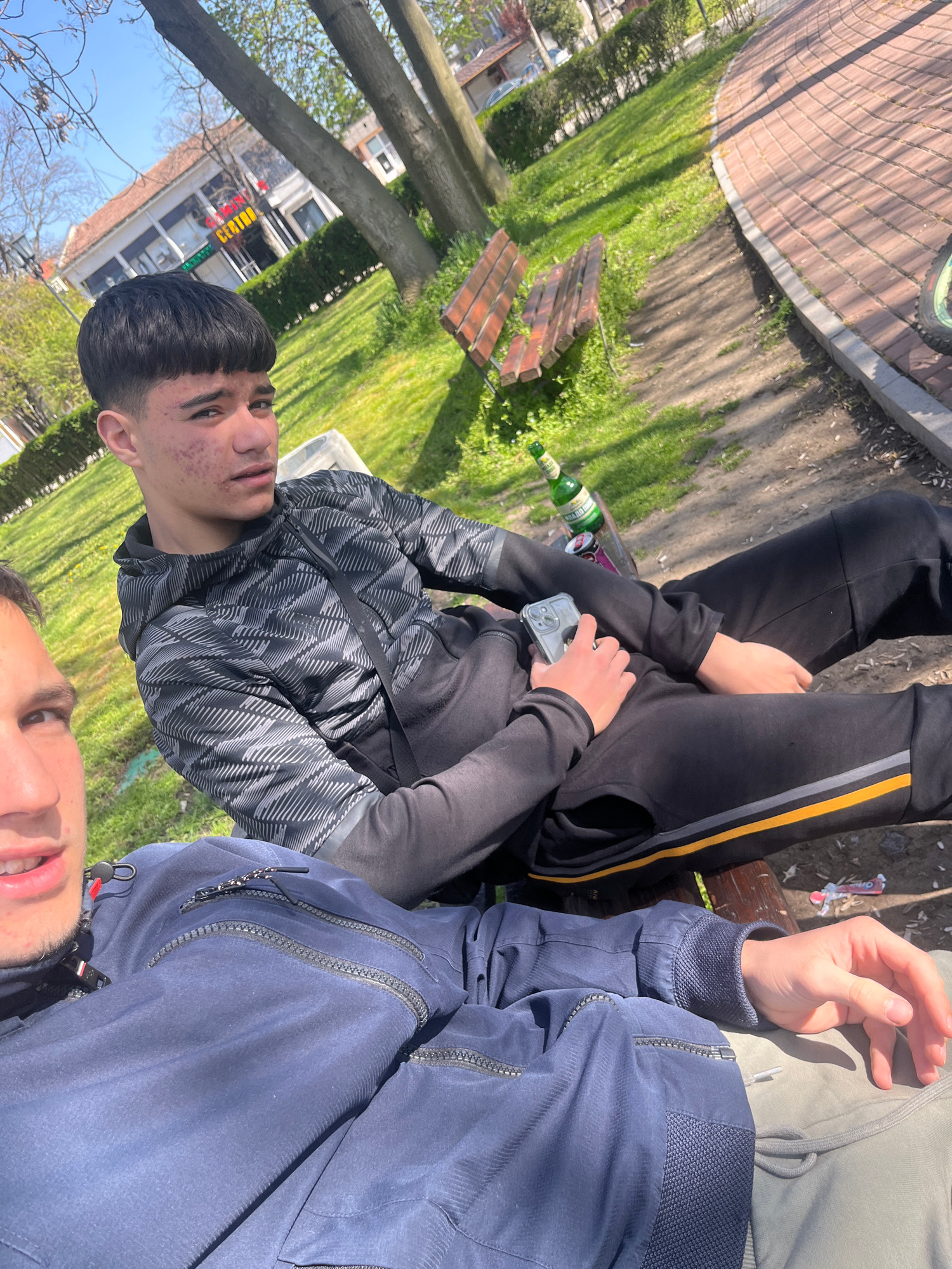The image depicts two young men sitting on a park bench in Saedinenie, Bulgaria. One of the men is wearing a gray and black patterned hoodie and black pants with a yellow and gray stripe. He is holdin…read more
