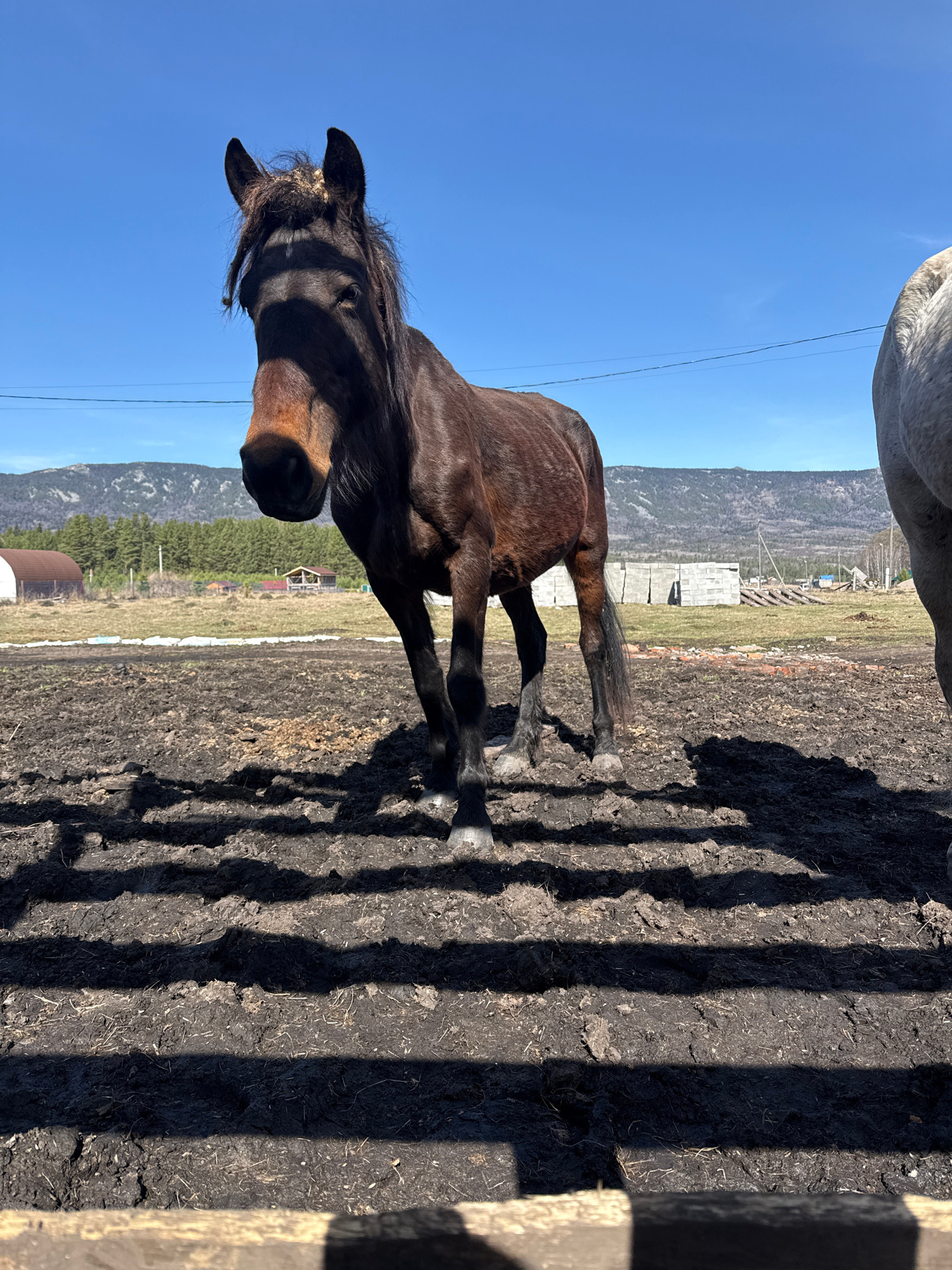 A dark brown horse stands in a paddock or enclosure under a clear, bright blue sky, with mountains visible in the distance. The image is captured on a sunny day, indicated by the strong, elongated sha…read more