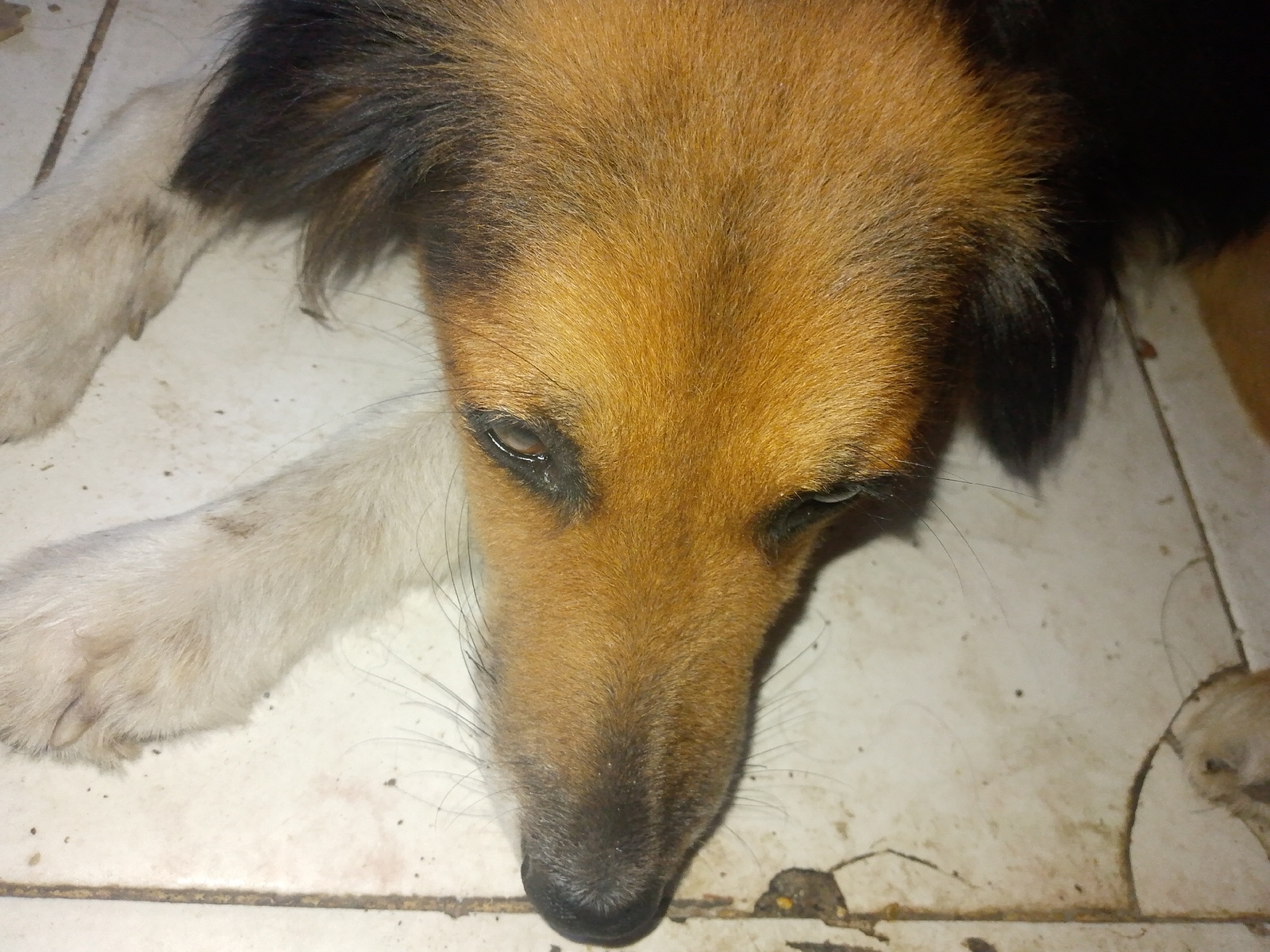 A close-up, top-down view shows a dog lying on a light-colored tile floor. The dog's head and one paw are visible. The dog has brown and black fur on its head and white fur on its paw. The tile floor…read more