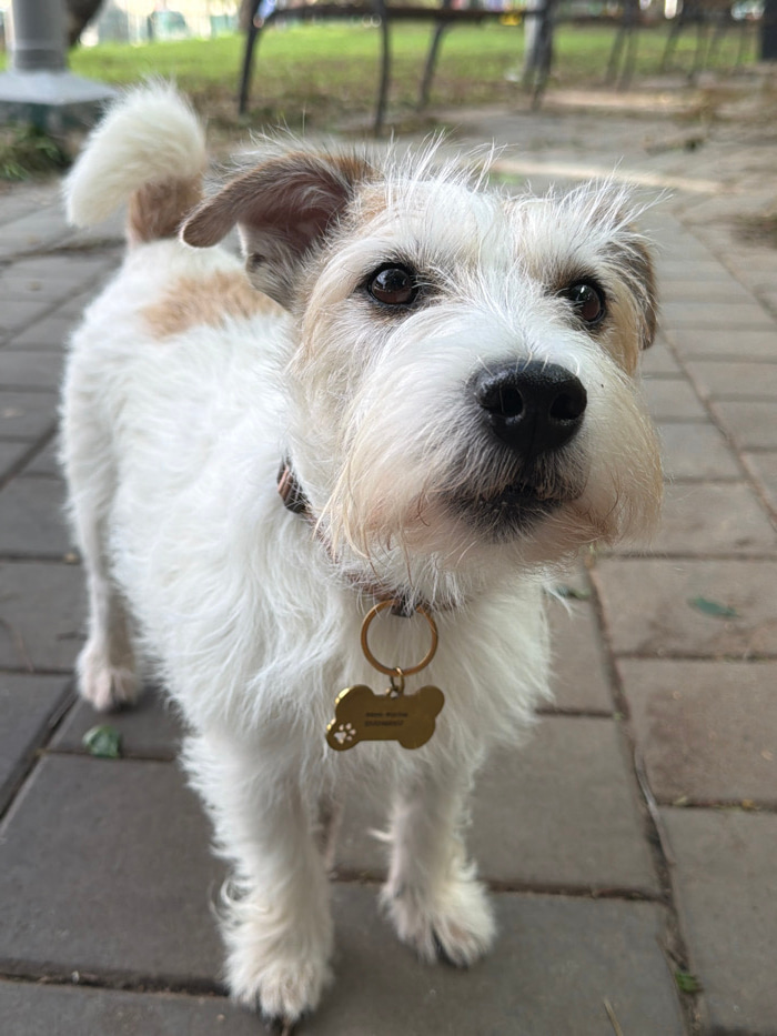 A white, wire-haired terrier-type dog with shaggy fur and light brown patches on its back and ears stands on a grey paved walkway in a public park in Bat Yam, Israel. The dog faces forward, exhibiting…read more