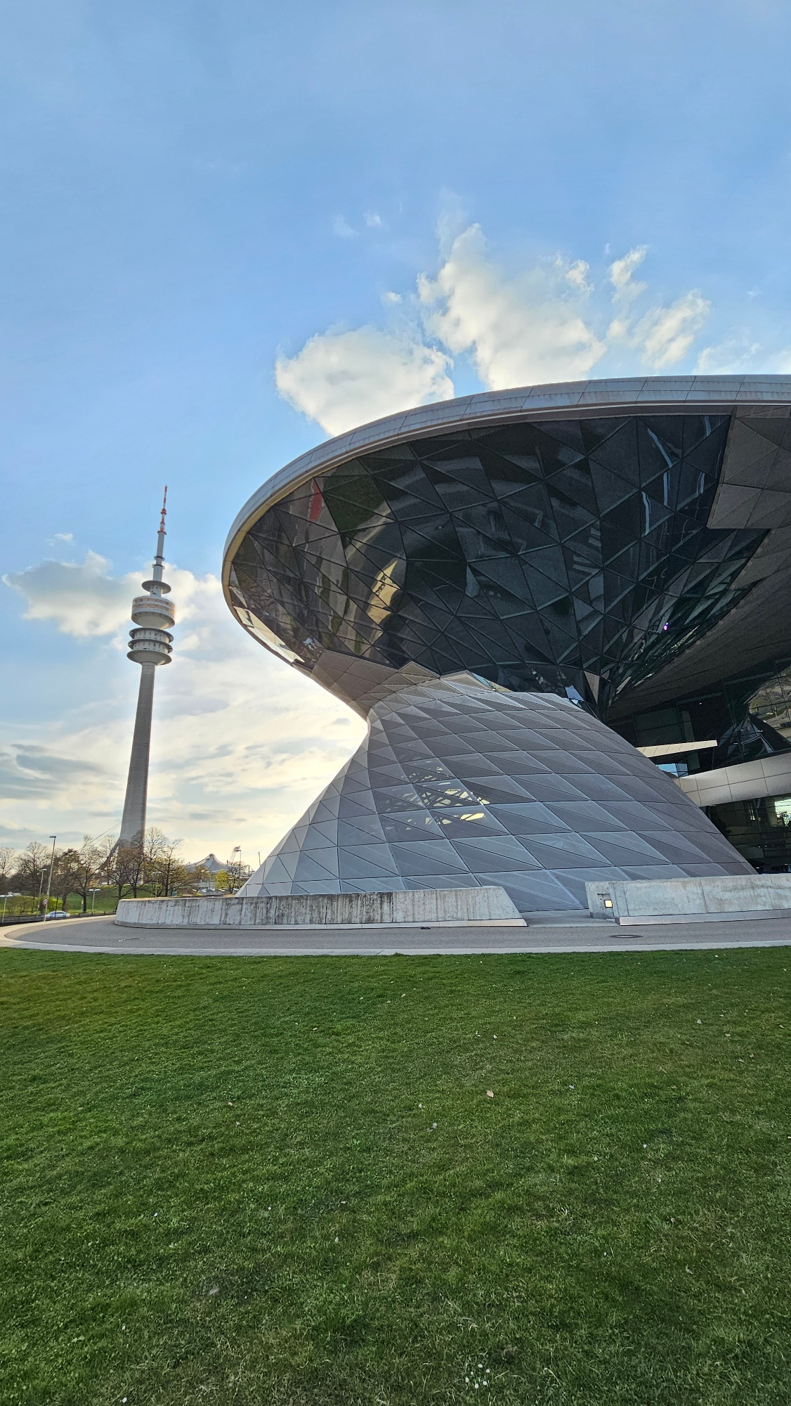 The image shows the BMW Welt building in Munich, Germany, with the Olympiaturm tower visible in the background. The BMW Welt is a modern architectural structure with geometric designs, adjacent to a g…read more