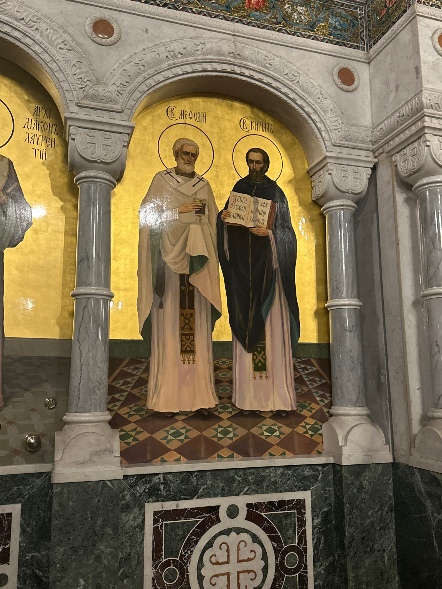 The image shows an interior architectural detail, specifically a wall section likely from a church, perhaps in Tula, Russia. The wall features two religious icons set against a gold background, enclos…read more