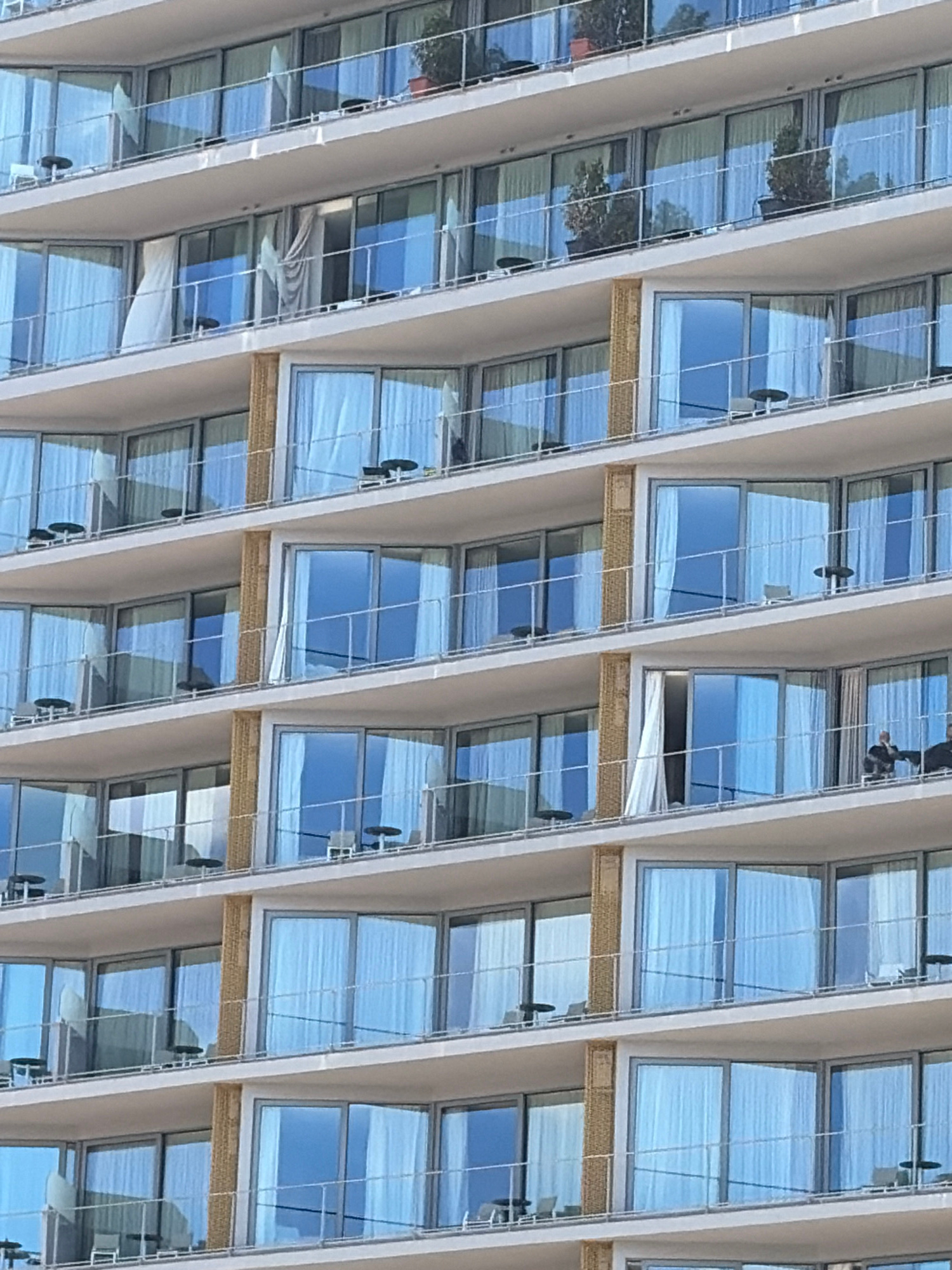 The image depicts a section of a building exterior in Bečići, Montenegro, notable for its repeated pattern of windows. The windows are open slightly, allowing glimpses of either interior spaces or the…read more