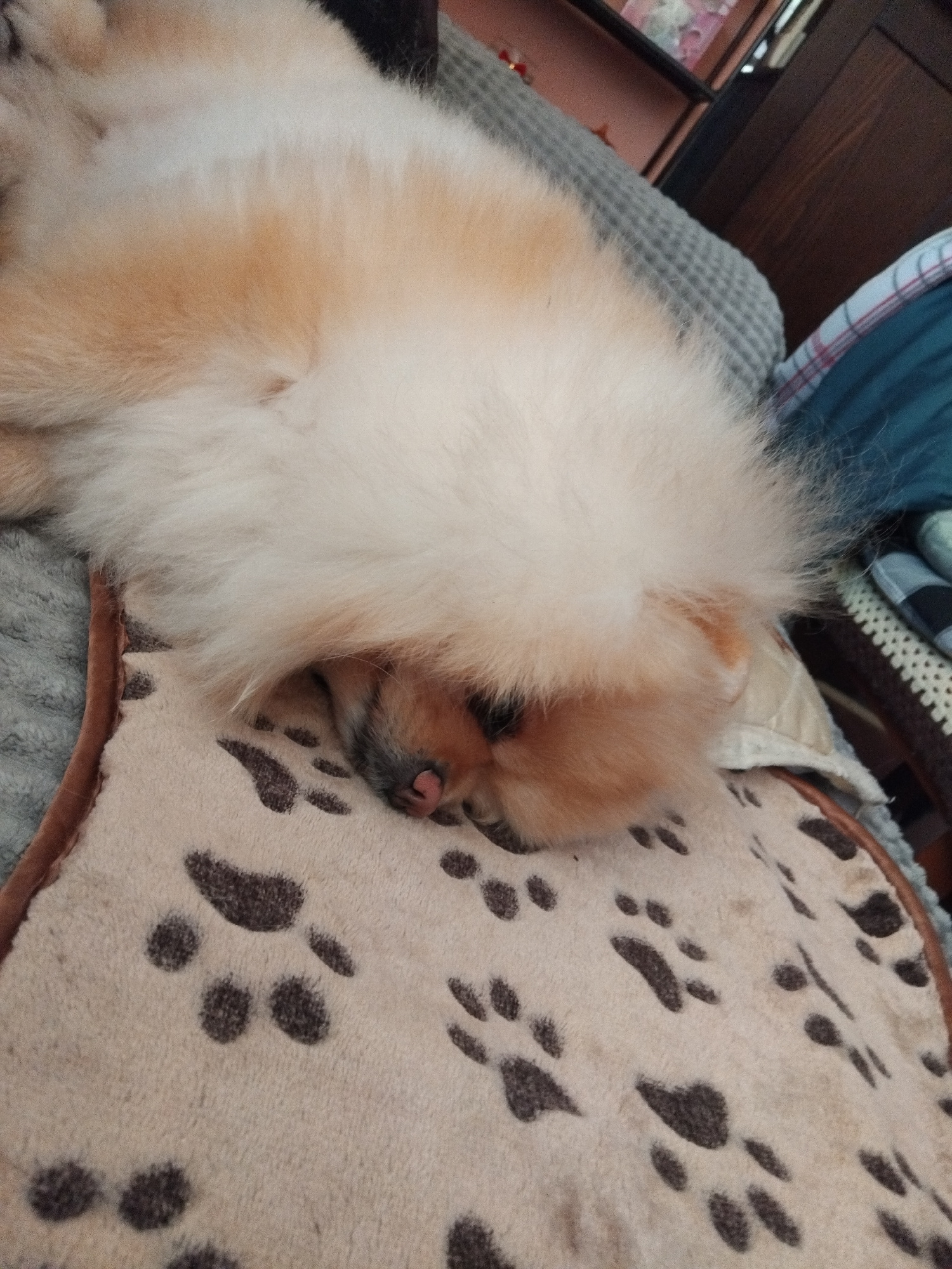 A Pomeranian dog is sleeping on a paw-print patterned dog bed. The dog has thick, fluffy cream and tan fur. The dog bed is light tan with brown paw prints and a brown trim. A gray, knitted blanket is…read more
