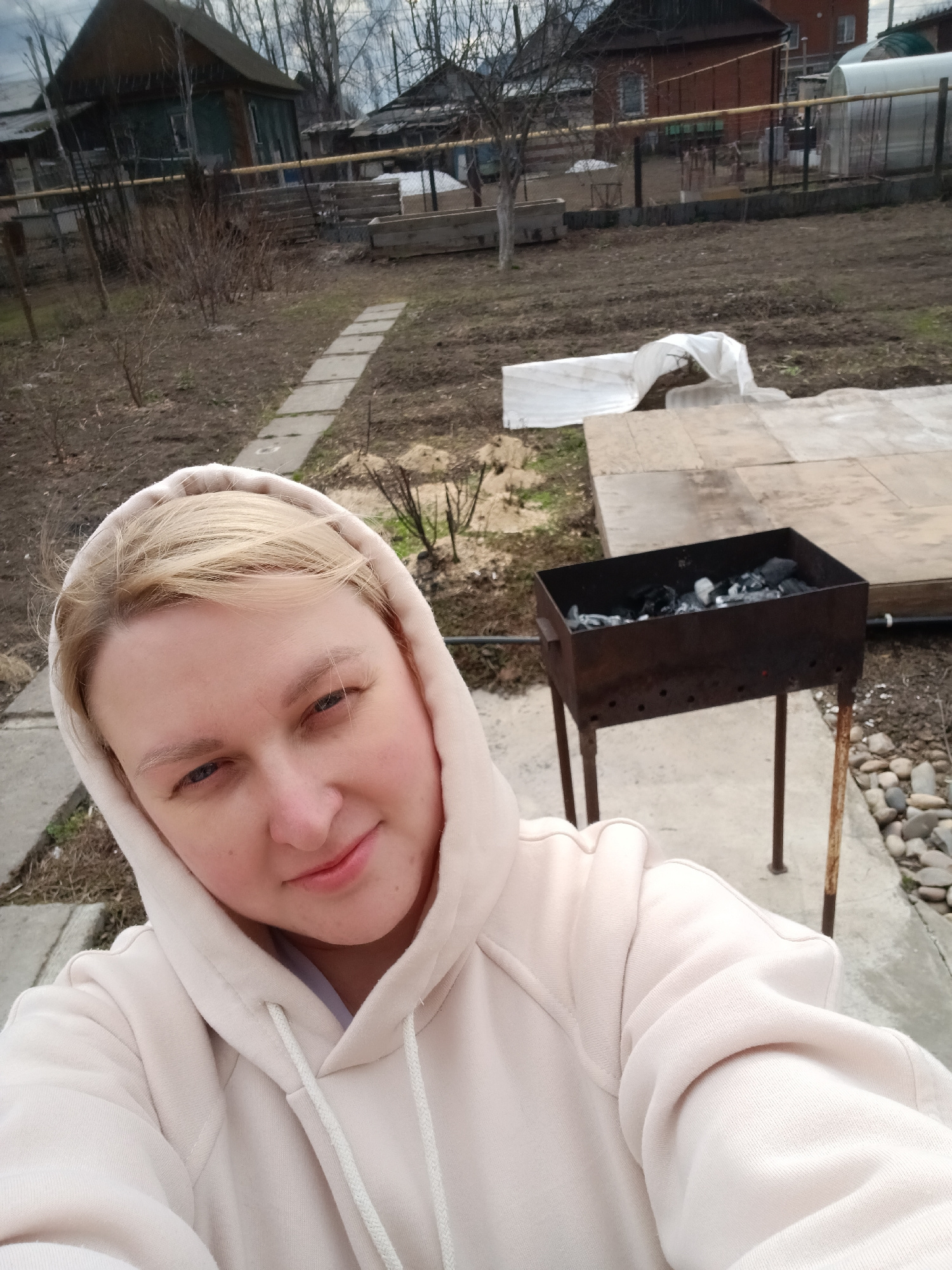 A blonde individual, likely female, wearing a light beige or off-white hooded sweatshirt, takes a selfie in what appears to be a backyard or garden in Chaikovsky, Russia. She looks directly at the cam…read more