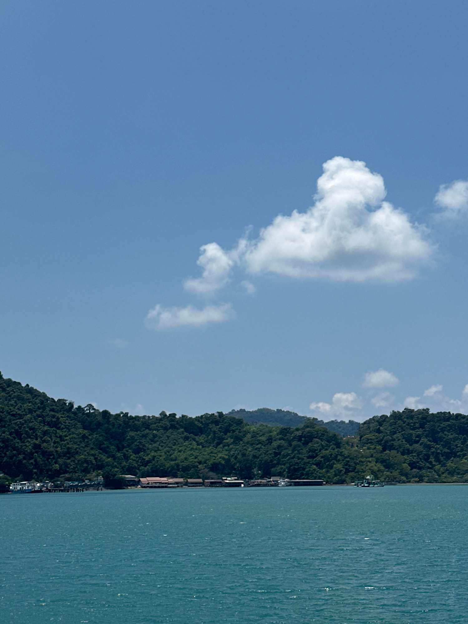 The image depicts a coastal scene in Baan Klong Son, Thailand. Lush, densely forested mountains extend along the coastline on the right, meeting the aquamarine water. Small buildings and structures ar…read more