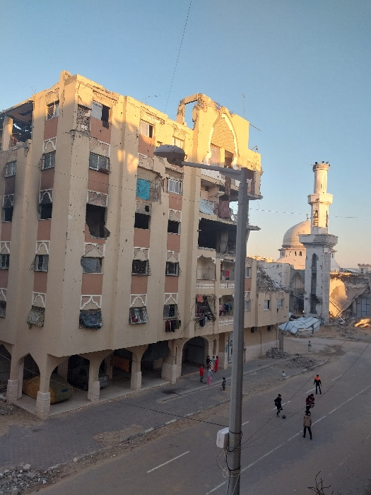 An elevated view captures a street scene in Khan Yunis, Palestinian Territory, characterized by significant structural damage under a clear, warm-toned sky suggesting early morning or late afternoon.…read more