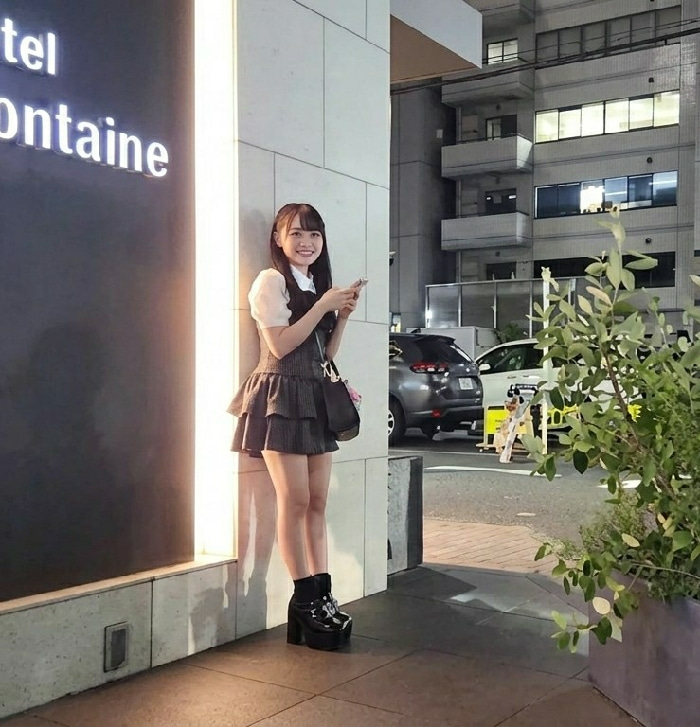 An outdoor, eye-level photograph depicts a young East Asian female standing on a paved sidewalk next to a building, in what is identified by a partially visible illuminated sign as "Hotel Fontaine", s…read more