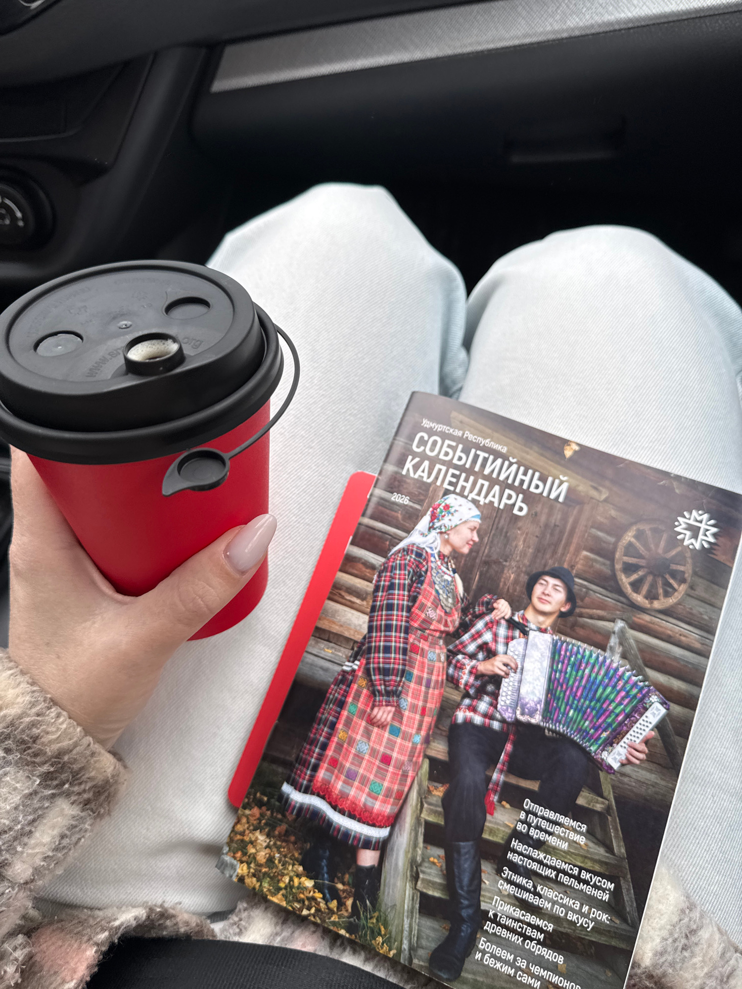 Here is a concise description of the image: The image shows a person sitting with a red travel mug in their hand. Resting on their lap is a calendar for the Republic of Udmurtia, Russia, specifically…read more