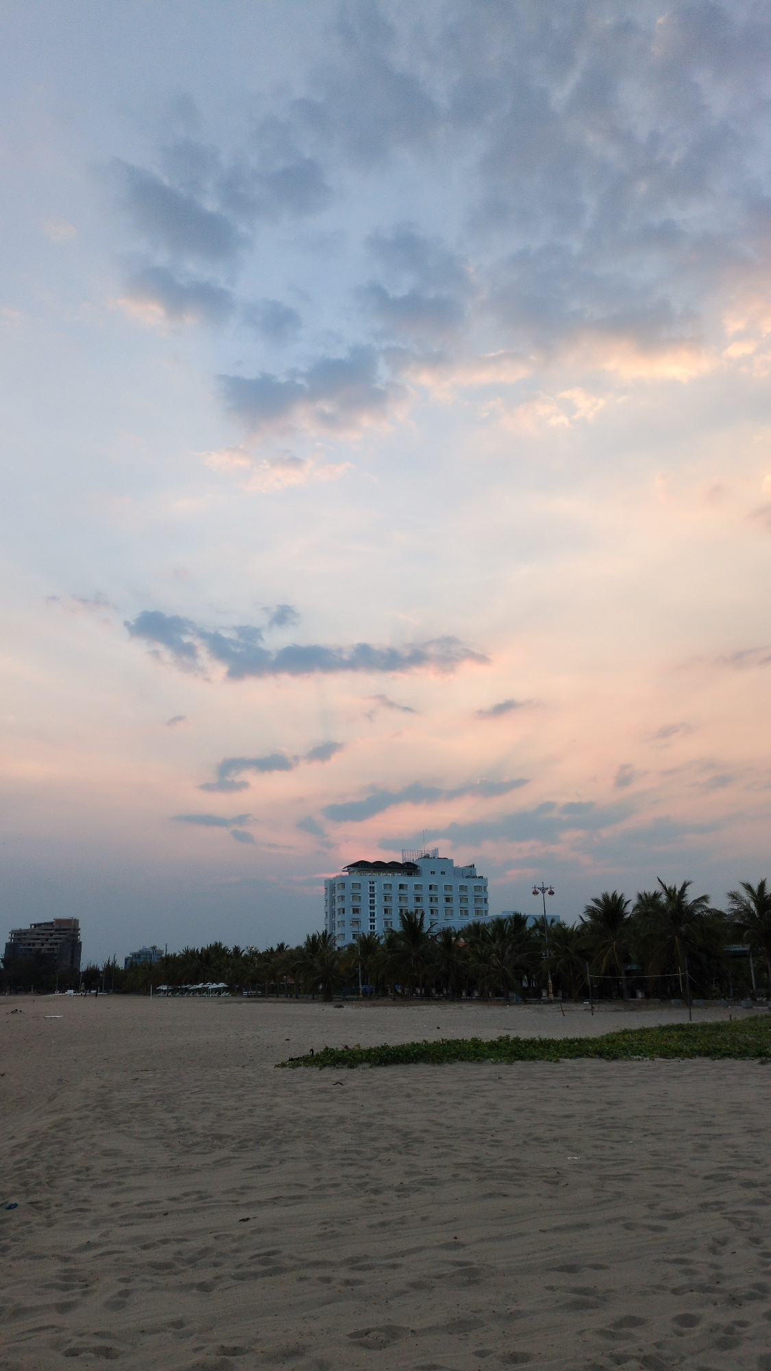 The image depicts a beach scene in Khánh Hải, Vietnam at sunset. The sky is filled with clouds, tinged with pink and blue hues. A multi-story building is visible near the coast, lined with palm trees.…read more