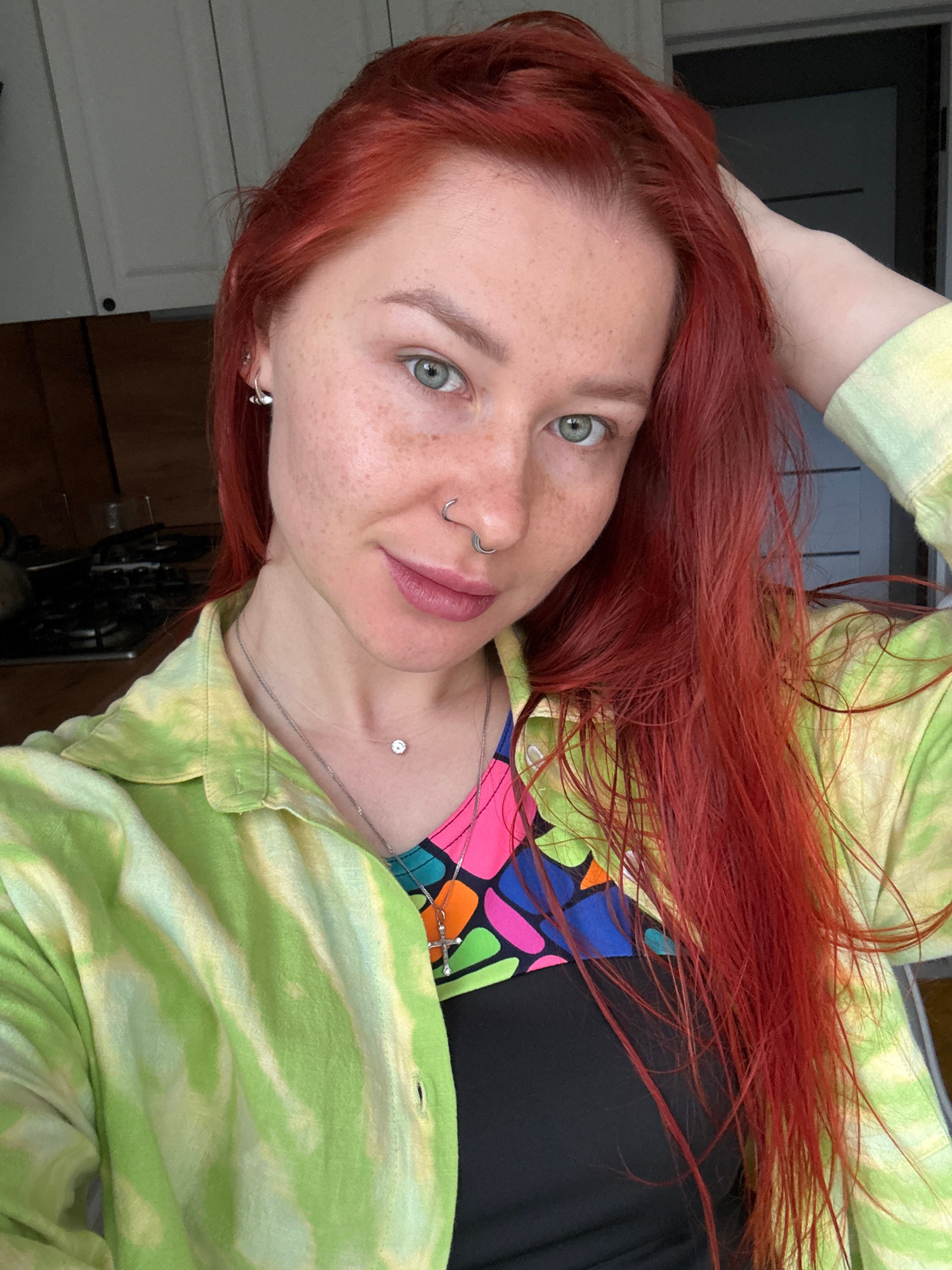 A selfie of a woman with red hair, green eyes, and freckles, wearing a tie-dye shirt, a colorful top underneath, and jewelry (earrings, nose ring, necklace, collarbone piercing). The background is non…read more