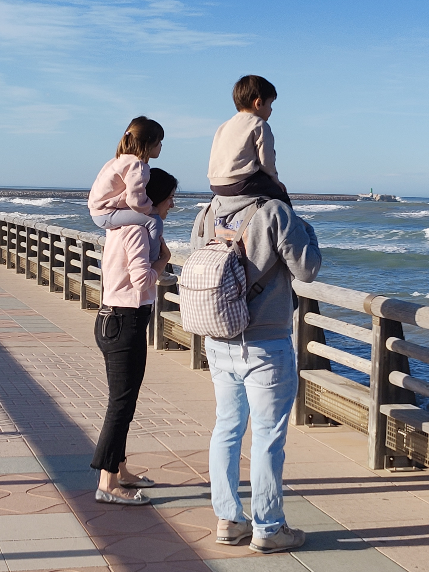 A family of three stands on a tiled promenade in Dénia, Spain, overlooking the sea. A woman in black pants and a pink jacket carries a young girl on her shoulders. The girl wears a pink shirt and look…read more