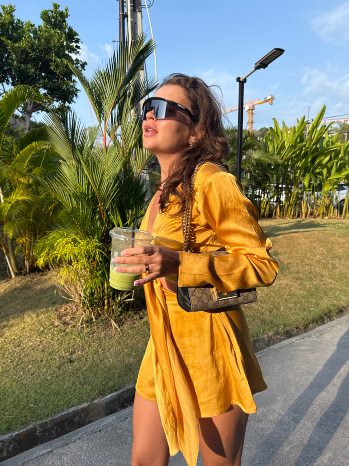 A female subject is captured mid-stride outdoors in Choeng Thale, Thailand, under a clear blue sky with strong sunlight. She walks from left to right in the frame, her head tilted upwards and slightly…read more