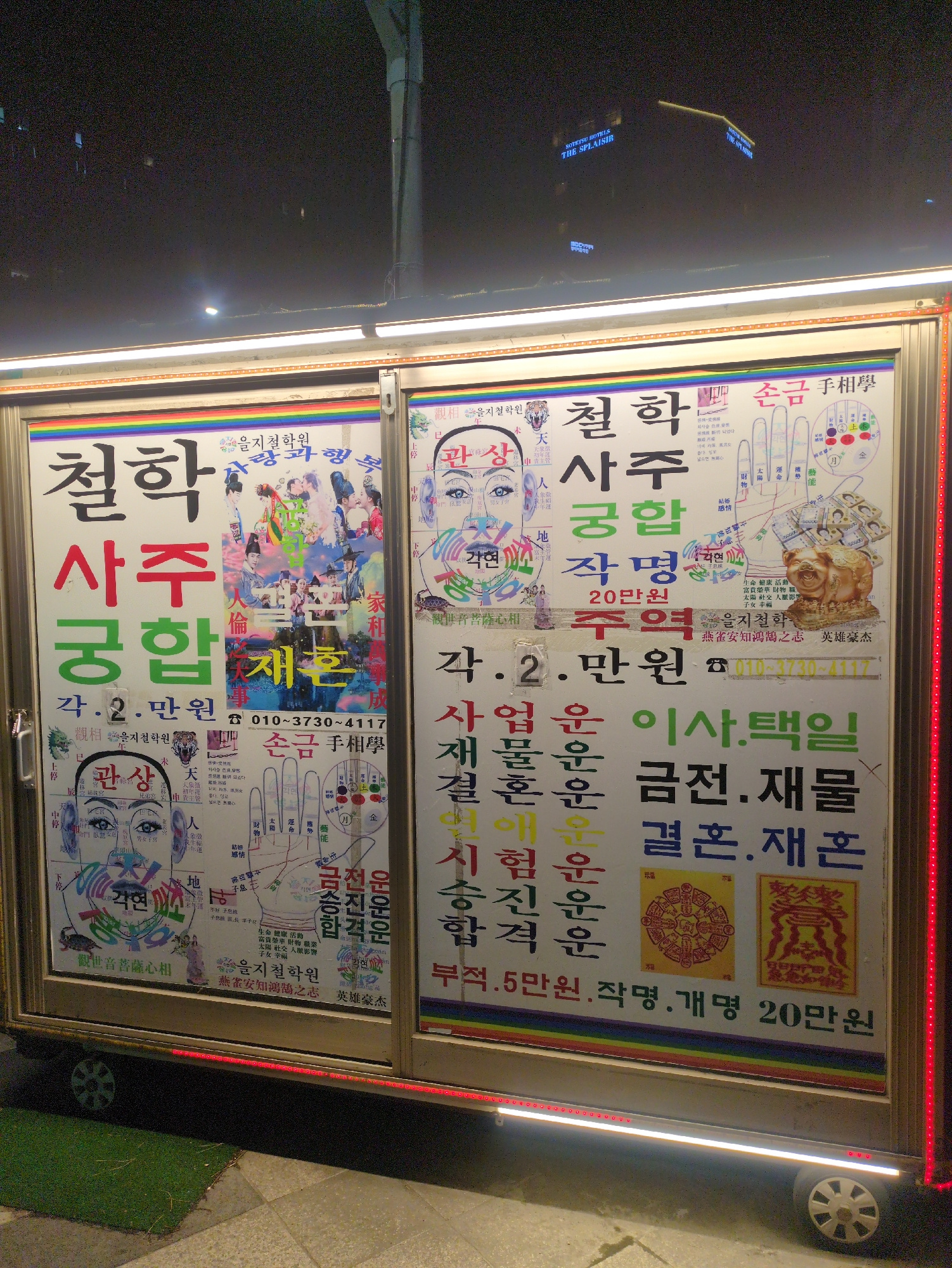 The image captures a mobile fortune-telling booth on a street, likely in Seoul, South Korea, judging by the Korean text. The booth features two large illuminated signs displaying information about pal…read more