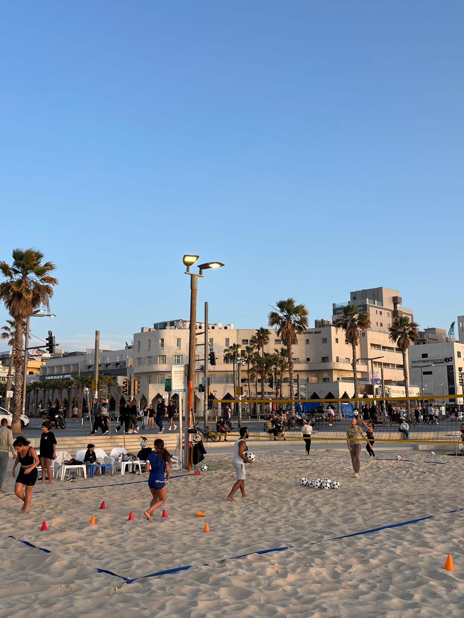 This outdoor image depicts a sandy beach area, likely in Tel Aviv, Israel, adjacent to a street lined with buildings and palm trees. The sky is clear and blue. People are engaging in beach activities,…read more