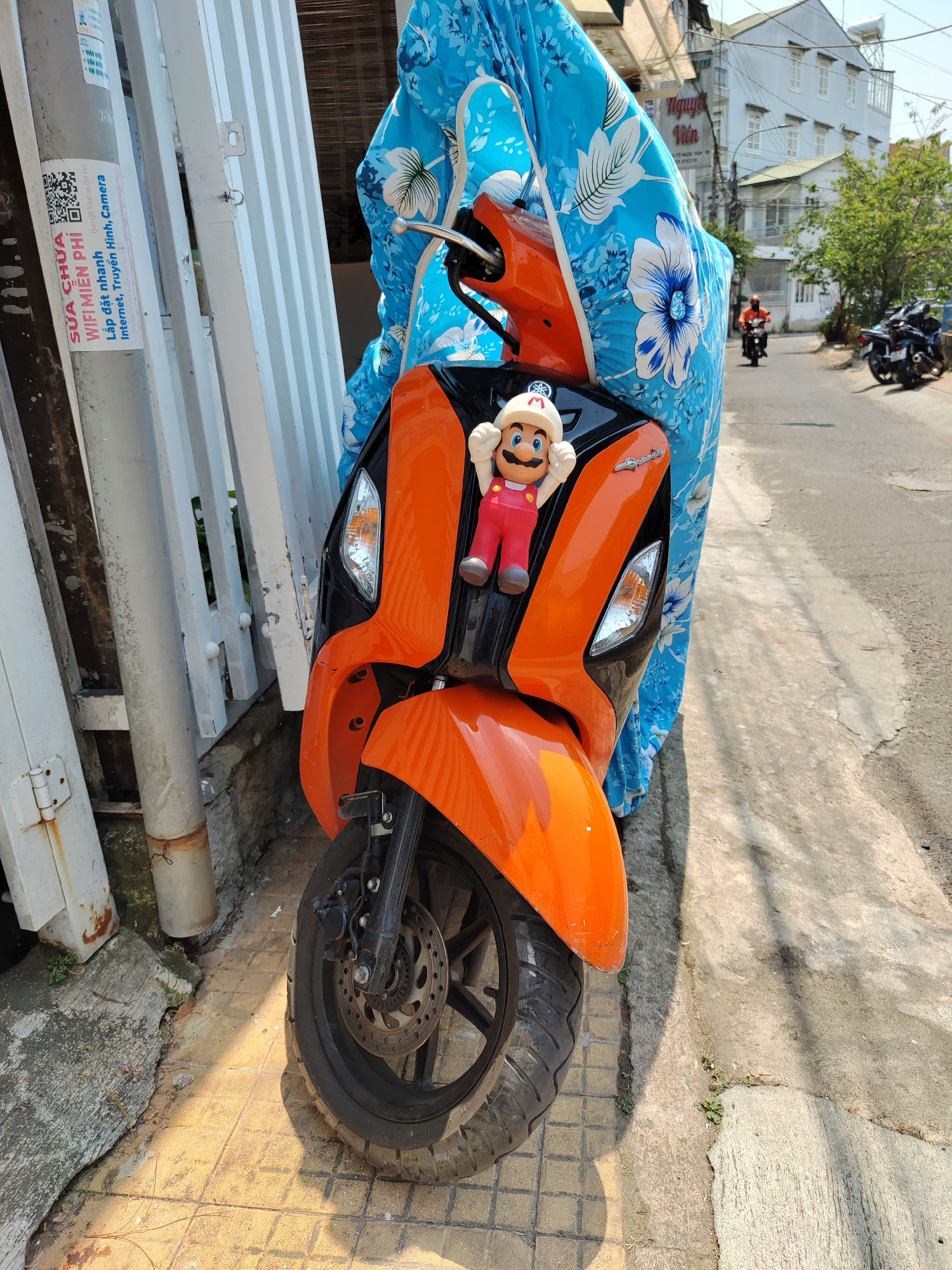 An orange and black scooter with a Mario figurine on its front is parked on a sidewalk in Thành phố Đà Lạt, Vietnam. The scooter is partially covered with a blue floral-patterned sheet. Next to the sc…read more
