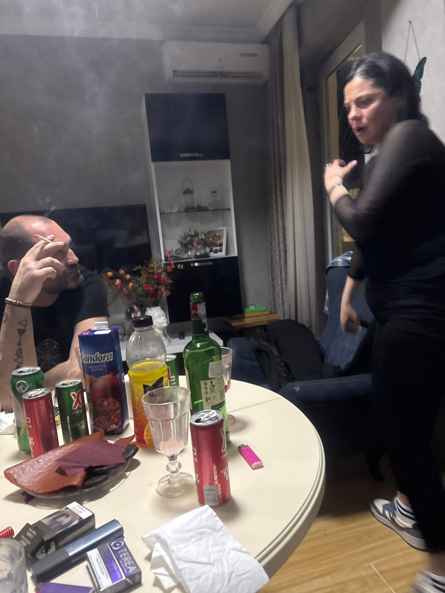 Two people are present in a dimly lit room. One individual, dressed in black, appears to be leaning over a round table. The second person, visible from the torso up, is seated near the table, smoking…read more