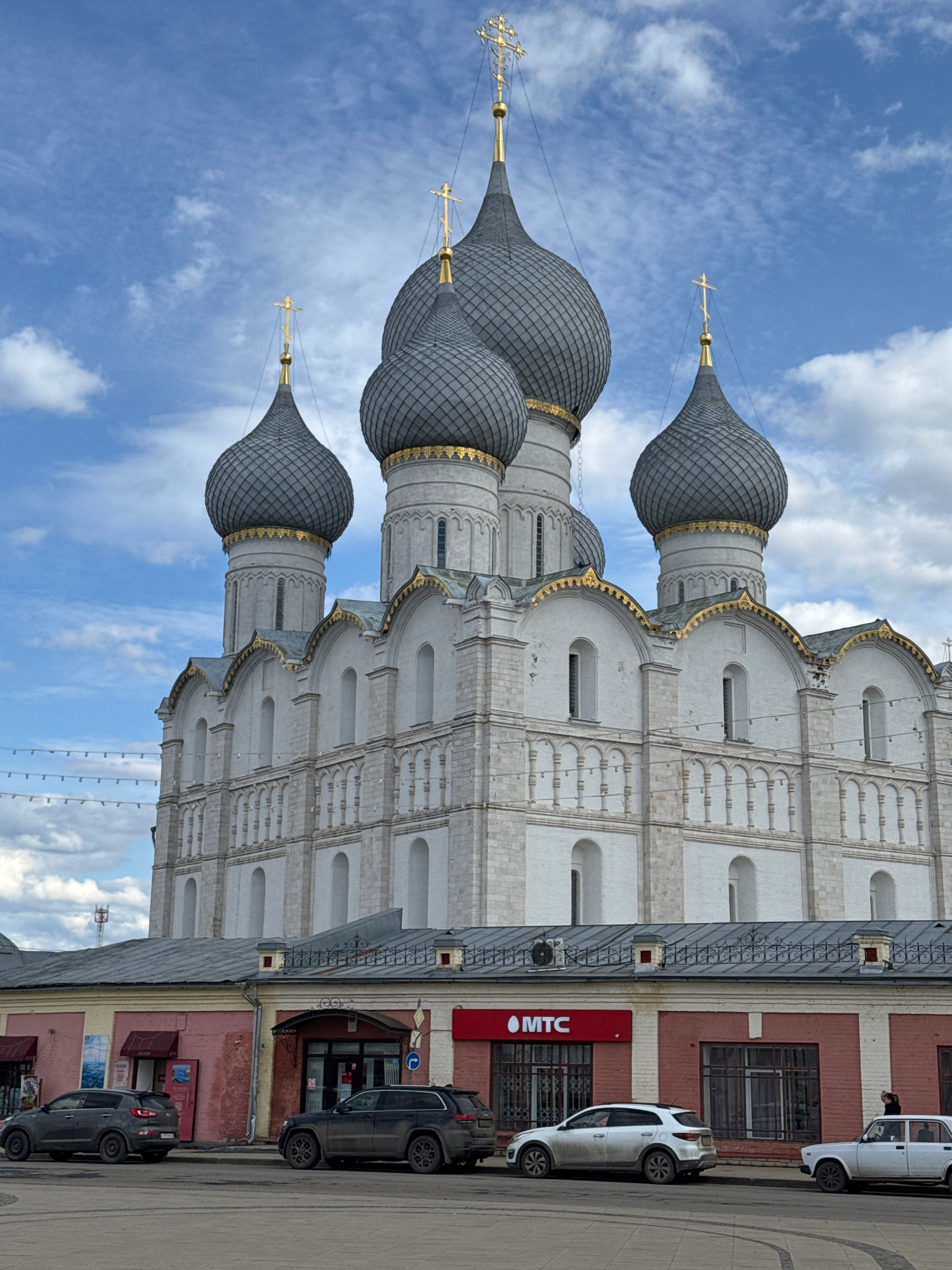The image shows a building in Ново-Никольское, Russia, specifically the church of St. John the Baptist. The church has multiple onion-shaped domes, each topped with a cross. The facade of the church i…read more